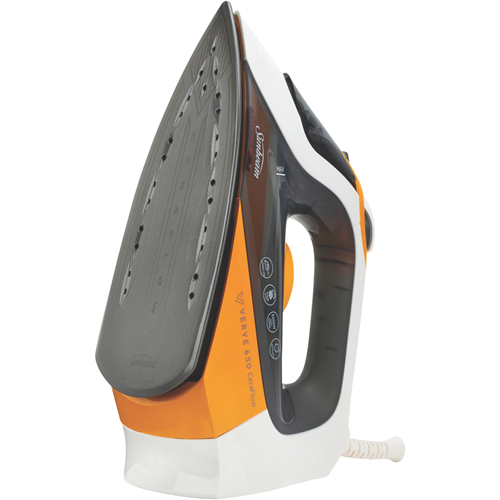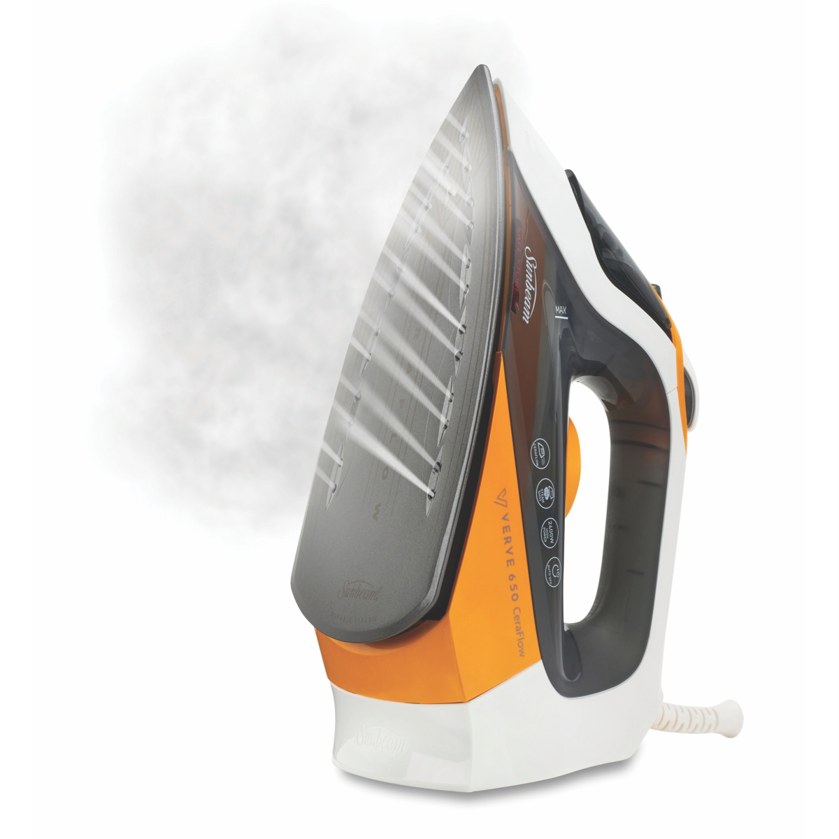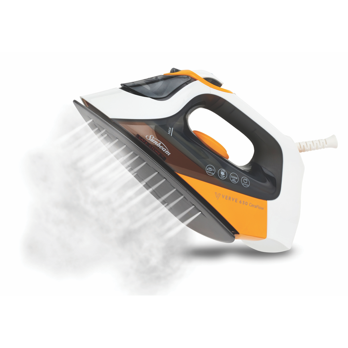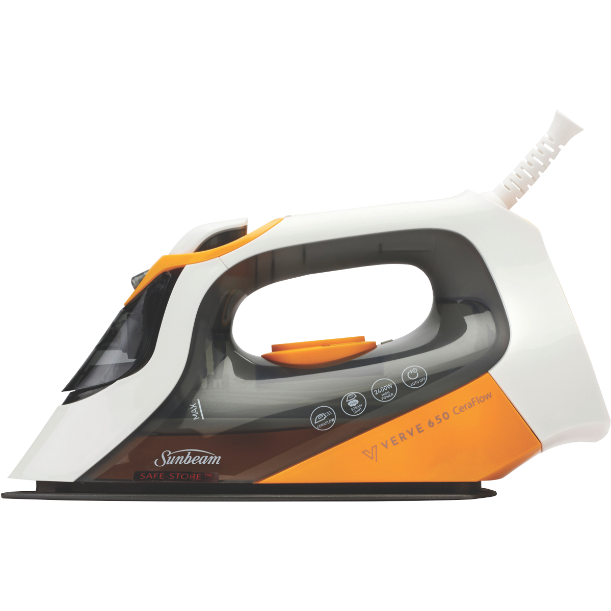 Bring your laundry to life with the Sunbeam Verve 650 Ceraflow Iron. This saffron-colored iron delivers powerful 2400-watt performance and superior glide thanks to its CeraFlow ceramic soleplate. Blast through wrinkles with the 150-gram steam shot while the 300ml water tank enables longer ironing sessions. Additional features like the anti-calc cartridge and auto shut off provide convenience and safety. With its 2500mm cord length 40 grams per minute of steam output and 1.72kg lightweight design this iron makes quick work of all your garments. The CeraFlow soleplate's smooth surface effortlessly glides over any fabric. Get crisp results in no time whether ironing cotton linen silk or wool. Tame even the toughest wrinkles with the concentrated steam burst. The anti-calc cartridge prevents mineral buildup so you can count on this iron to keep performing optimally. Once you're done ironing the auto shut off gives you peace of mind by turning the iron off automatically after 30 seconds of inactivity. Bring professional results into your home with the Sunbeam Verve 650 Ceraflow Iron. The manufacturer's part number for this product is SRC6500. Discover how this quality iron can make easy work of your laundry days.