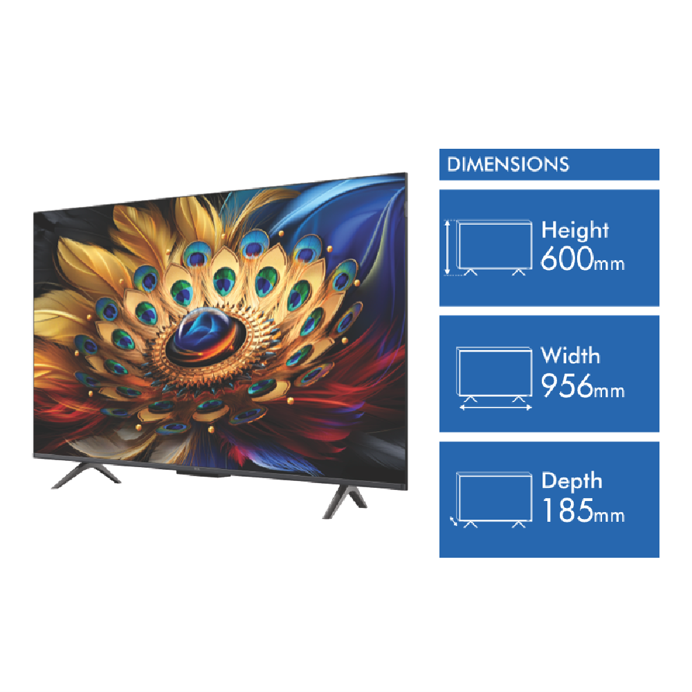 Experience stunning visuals and immersive entertainment with the TCL 43 C655 QLED Google TV 24. This 43-inch ultra HD TV boasts a vibrant QLED display with Quantum Dot technology delivering lifelike colours and exceptional clarity. The powerful AiPQ Pro Processor optimizes picture quality for a captivating viewing experience. Enjoy seamless access to your favourite streaming apps like Netflix Stan Disney+ and more with the intuitive Google TV platform. The built-in Google Assistant and Amazon Alexa compatibility provide hands-free voice control for effortless navigation. Immerse yourself in cinematic sound with Dolby Atmos and DTS Virtual: X audio technologies. With a 60Hz refresh rate and 100 motion rate this TV is also gaming-ready for smooth gameplay. The C655 series features multiple eye care settings to reduce eye strain during extended viewing sessions. Measuring 956mm wide 600mm high and 185mm deep this sleek TV fits perfectly in any living space. The manufacturer's part number for this product is 43C655. Elevate your home entertainment setup with the TCL 43 C655 QLED Google TV 24 and experience a new level of visual brilliance. 43C655 is the manufacturer's part number of this product. Bring home the TCL 43 C655 QLED Google TV 24 today and transform your viewing experience.