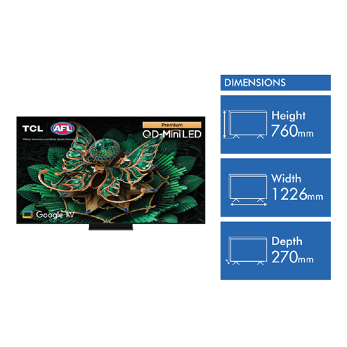 Experience cinema-quality visuals at home with this TCL 55 C7K Premium QD Mini LED Google TV. Its 55-inch screen with QD-Mini LED technology delivers stunning Ultra HD resolution and vibrant colours thanks to Quantum Dot. The AiPQ Pro processor and Full Array Local Dimming create sharp lifelike images with deep blacks and bright highlights up to 3000 nits. Enjoy smooth action with a 120Hz refresh rate and 6.5ms response time perfect for gaming. The Google TV system gives you easy access to streaming apps while voice control adds convenience. Audio by Bang & Olufsen (60W) with Dolby Atmos provides immersive sound to match the picture quality. This slim TV fits nicely in most spaces and can be wall-mounted if needed. It comes with a 3-year warranty for peace of mind. The TCL 55C7K is a feature-packed TV that brings the cinema experience right to your living room.