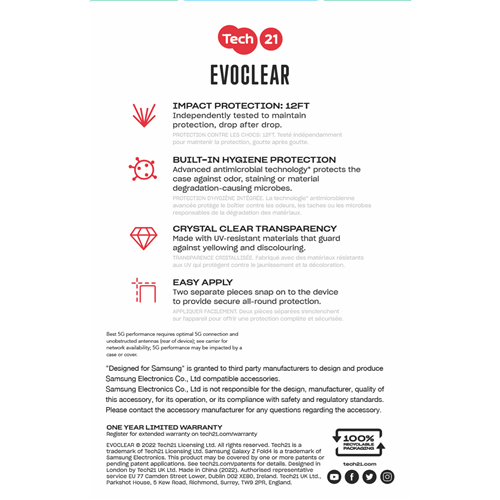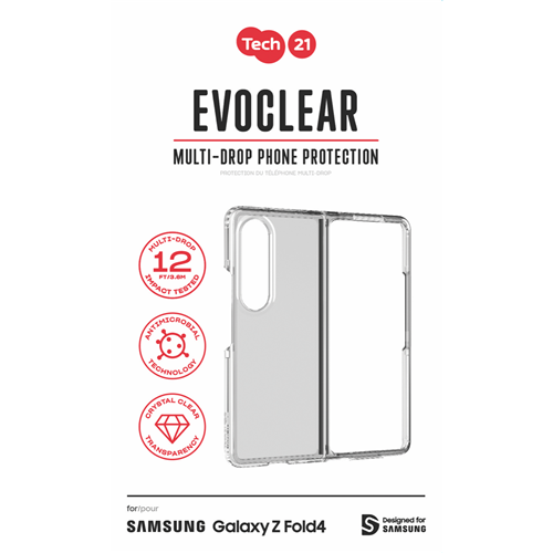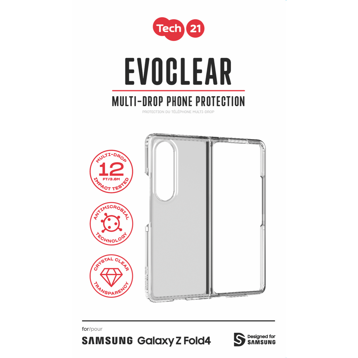 Protect your Galaxy Z Fold4 in style with the clear Tech21 EvoClear Case. This transparent phone case lets you show off your Fold4's design while keeping it safe from scratches and drops. Made from FlexShock material the EvoClear Case absorbs and disperses impact force away from your phone. Its ultra-thin profile and lightweight feel make this case a pleasure to use daily. The anti-yellowing technology also ensures the case retains its crystal clear look over time. With precise cutouts for ports buttons and cameras you'll enjoy unrestricted access to all your phone's features. The EvoClear Case for Galaxy Z Fold4 provides reliable 1-year protection without adding bulk to your device. The manufacturer's part number for this product is T21-9557. Slip on this slim yet protective case to keep your Fold4 looking as immaculate as the day you unboxed it.