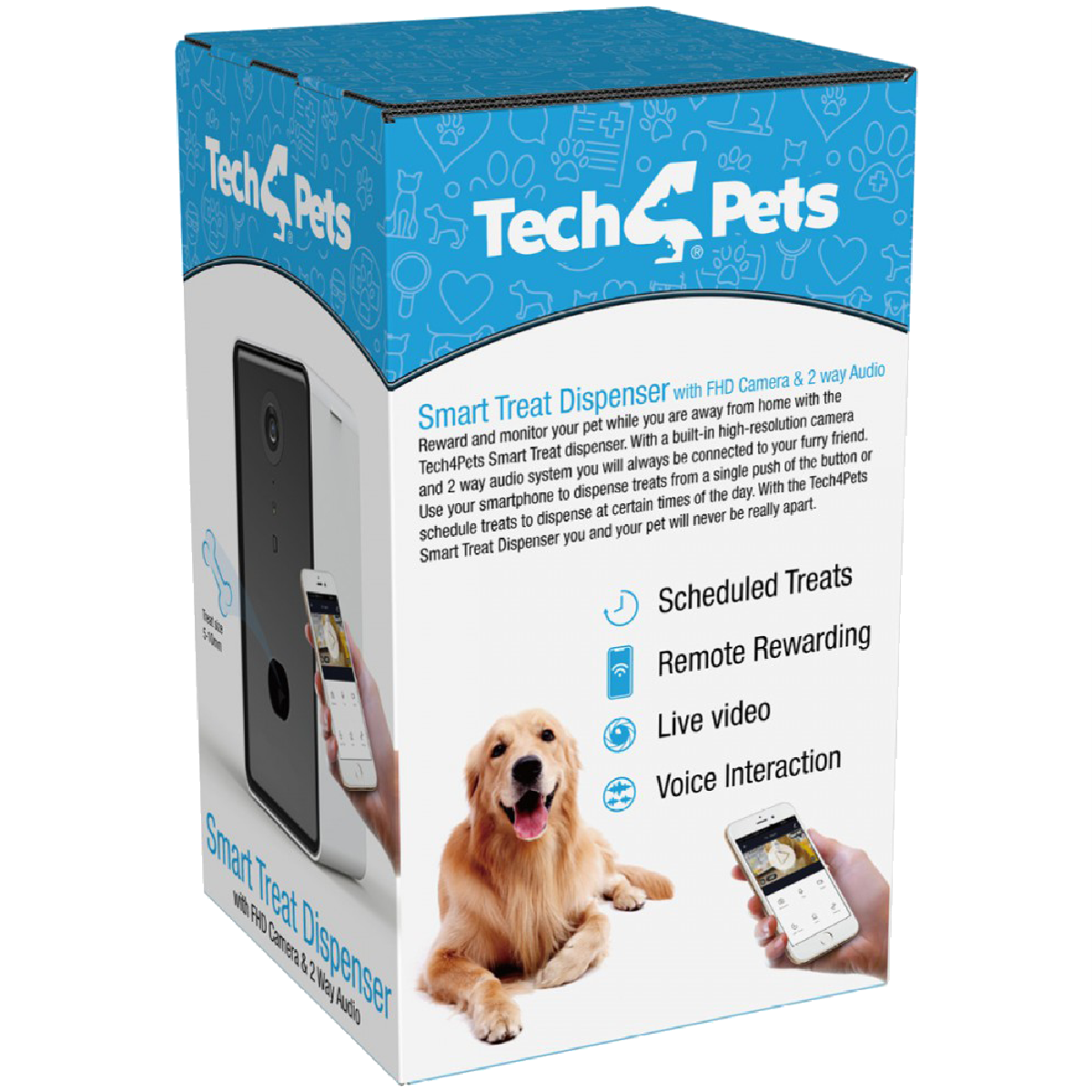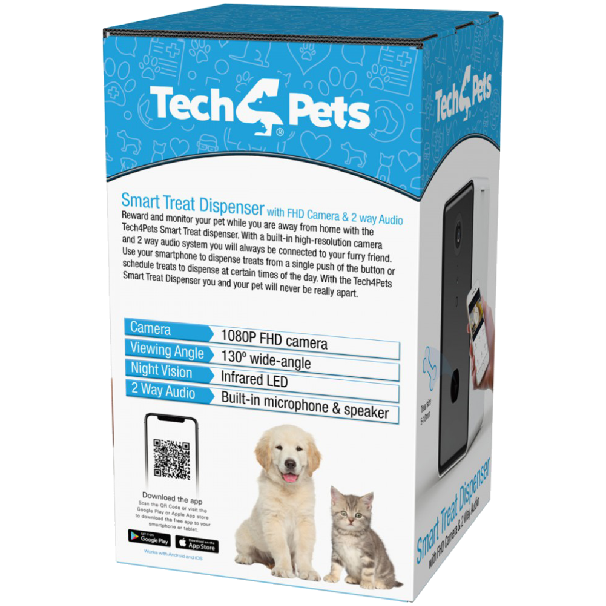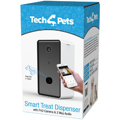The Tech4Pets Smart Treat Dispenser with Video is a white Wi-Fi enabled pet feeder that allows you to connect with and feed your furry friend from anywhere. With two-way audio you can hear your pet and even talk to them through the dispenser. Just connect it to your home Wi-Fi download the app and you'll be able to view live video of your pet dispense treats and even schedule automatic treat dispensing. The treat dispenser works with Google Assistant and Amazon Alexa for hands-free voice control. Power it with the included Micro USB cable and wall adapter and you'll be good to go. With one year manufacturer's warranty you can feel confident in the quality and reliability of this innovative pet care product. Give your pet a smart way to stay happy healthy and connected no matter where you are. The manufacturer's part number for this product is T4P-TRTPOOPER. Consider the Tech4Pets Smart Treat Dispenser today for a smarter more convenient way to love your pet.