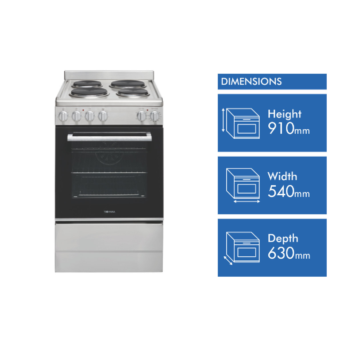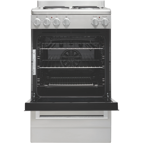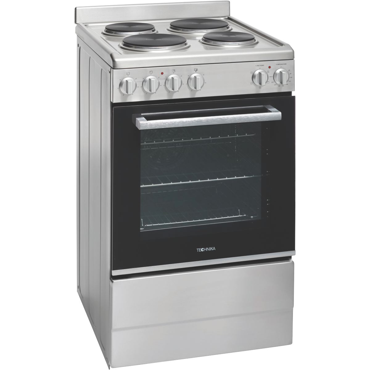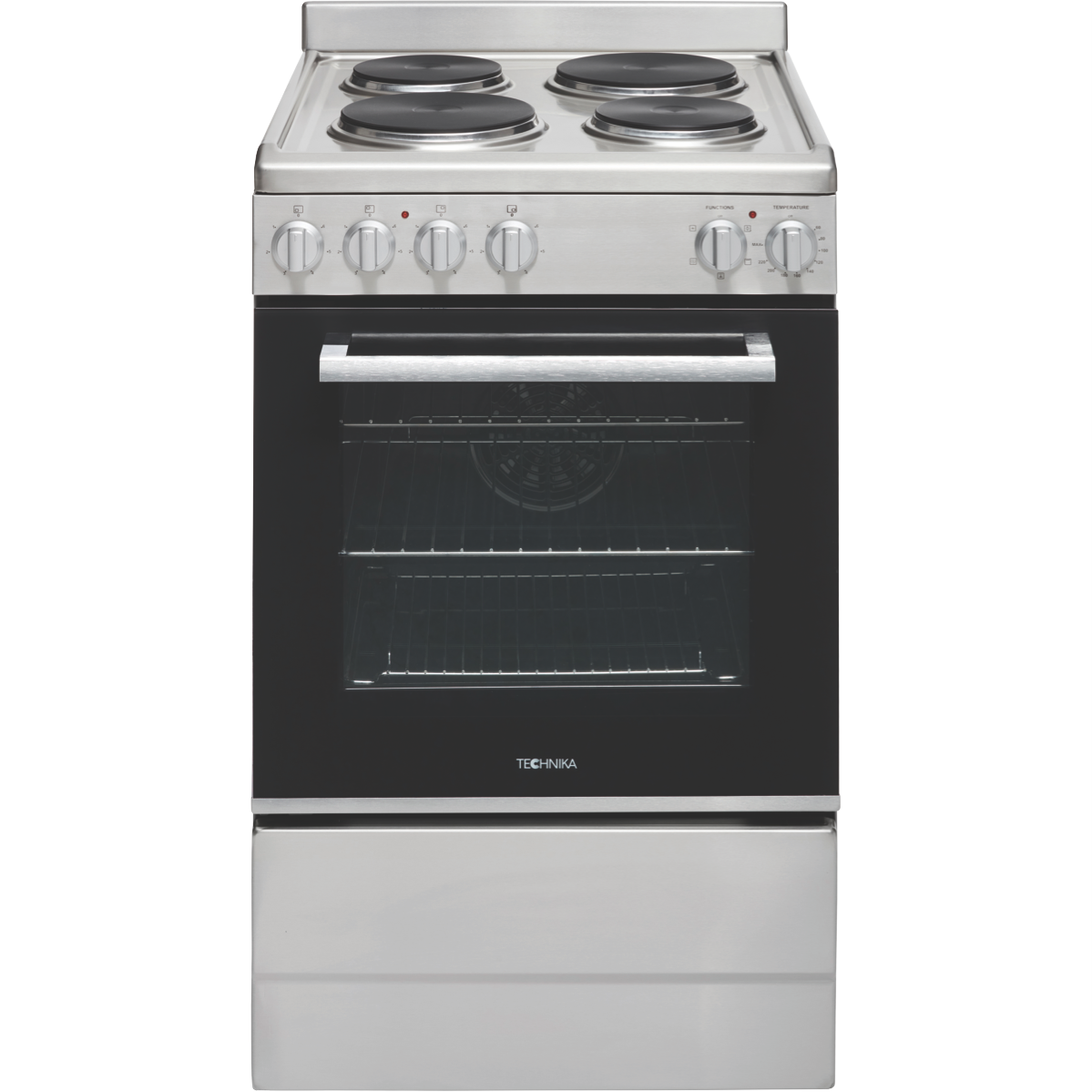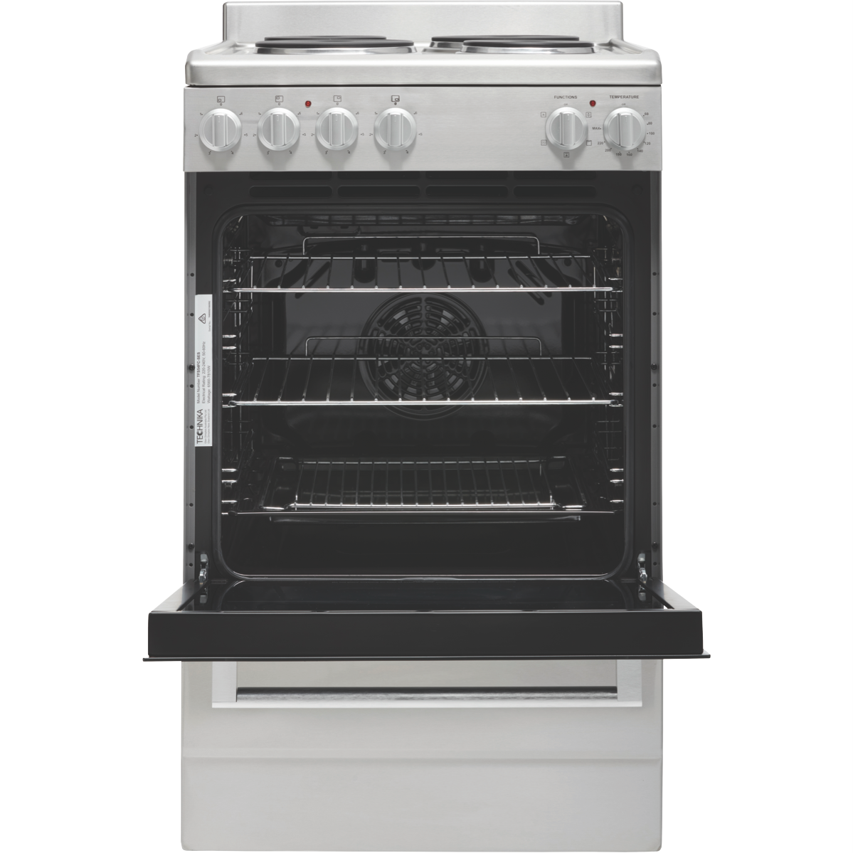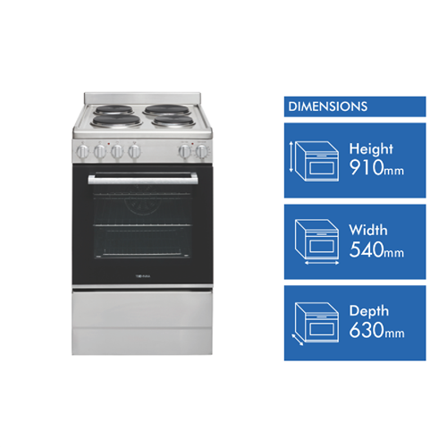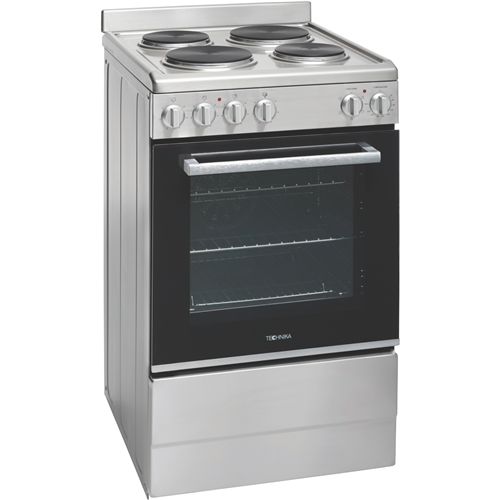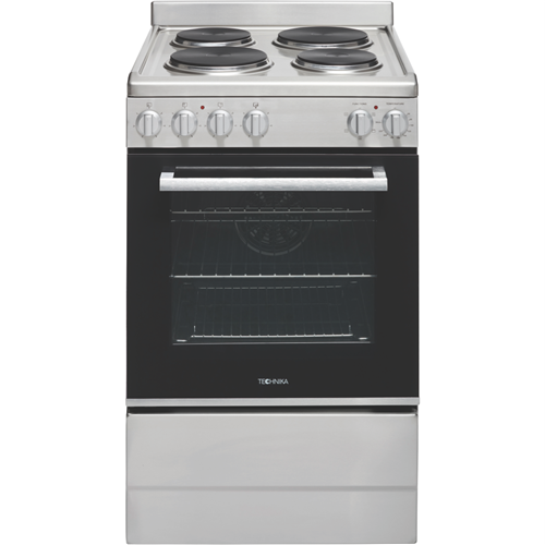 Step up your cooking game with the Technika 54cm Electric Upright Cooker. This stainless steel freestanding oven adds modern style to any kitchen while offering versatile functionality to meet all your baking and roasting needs. The generous 83L capacity provides ample room for preparing family-sized meals. Cook everything from crispy pizzas to juicy roasts with the five built-in oven functions including grill fan grill fan forced defrost and interior light. The double glazed door locks in heat and enhances energy efficiency. Four solid electric hotplates on the cooktop allow you to boil simmer and sear. Convenient control knobs make operation a breeze. The removable side racks and five shelf positions enable customized oven space. An integrated cooling system prevents the exterior from getting too hot. Technika covers this cooker with a 2-year warranty so you can purchase with confidence. Add this quality electric oven to your countertop and take your culinary skills to new heights. The manufacturer's part number for this product is TFS54FC-SES.