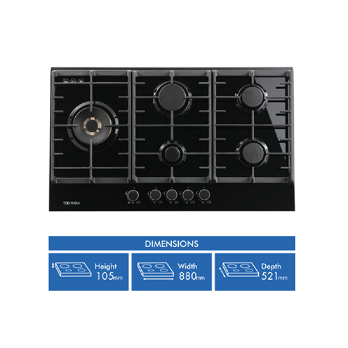 This spacious 90cm gas-on-glass black Technika gas cooktop has five burners including a dual valve wok burner so you can go from high-powered stir-frying or boiling right down to the lowest of simmers using the small inner flame only. The Technika TGC9GLBK features electronic ignition allowing you to achieve the level of gas you need very quickly by operating the conveniently-positioned front control knobs. It has cast iron trivets and burner caps to effortlessly hold the heaviest of cookware. Keeping your Technika black glass gas cooktop clean is easy with a wipe using a damp cloth and a mild non-abrasive cleaning detergent for more stubborn residue. You'll easily get different meals cooking at once with this generously-sized Technika gas cooktop.
