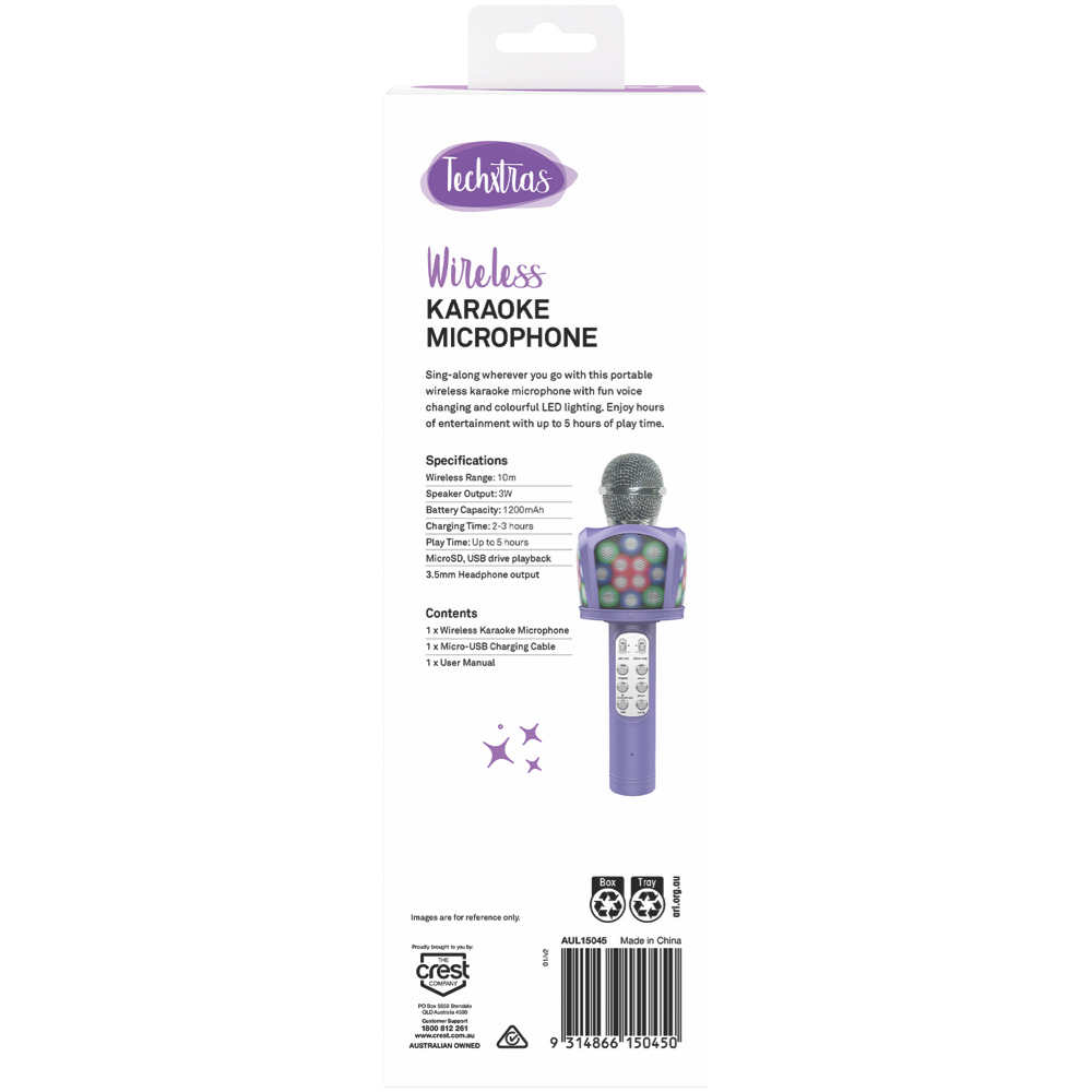Sing your heart out with this Purple Wireless Karaoke Microphone that connects easily via Bluetooth to your favourite devices. The sleek purple design makes it stand out at parties while delivering wireless freedom as you perform. Because it's completely wireless you can move around freely without tripping over cords making your karaoke sessions more fun and interactive. This lightweight microphone is perfect for home entertainment or small gatherings where everyone wants a turn at the spotlight. Model AUL15045.