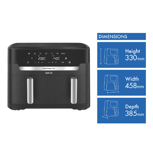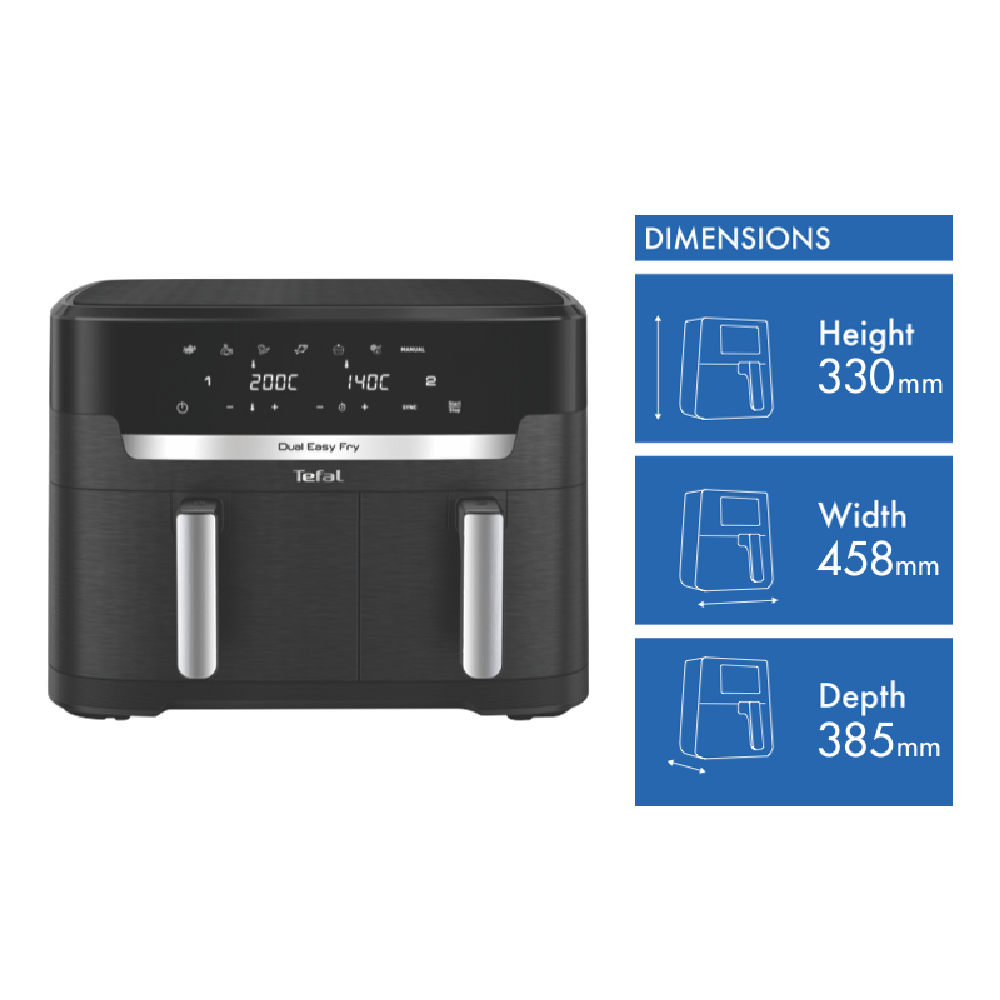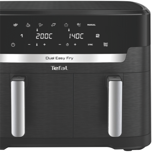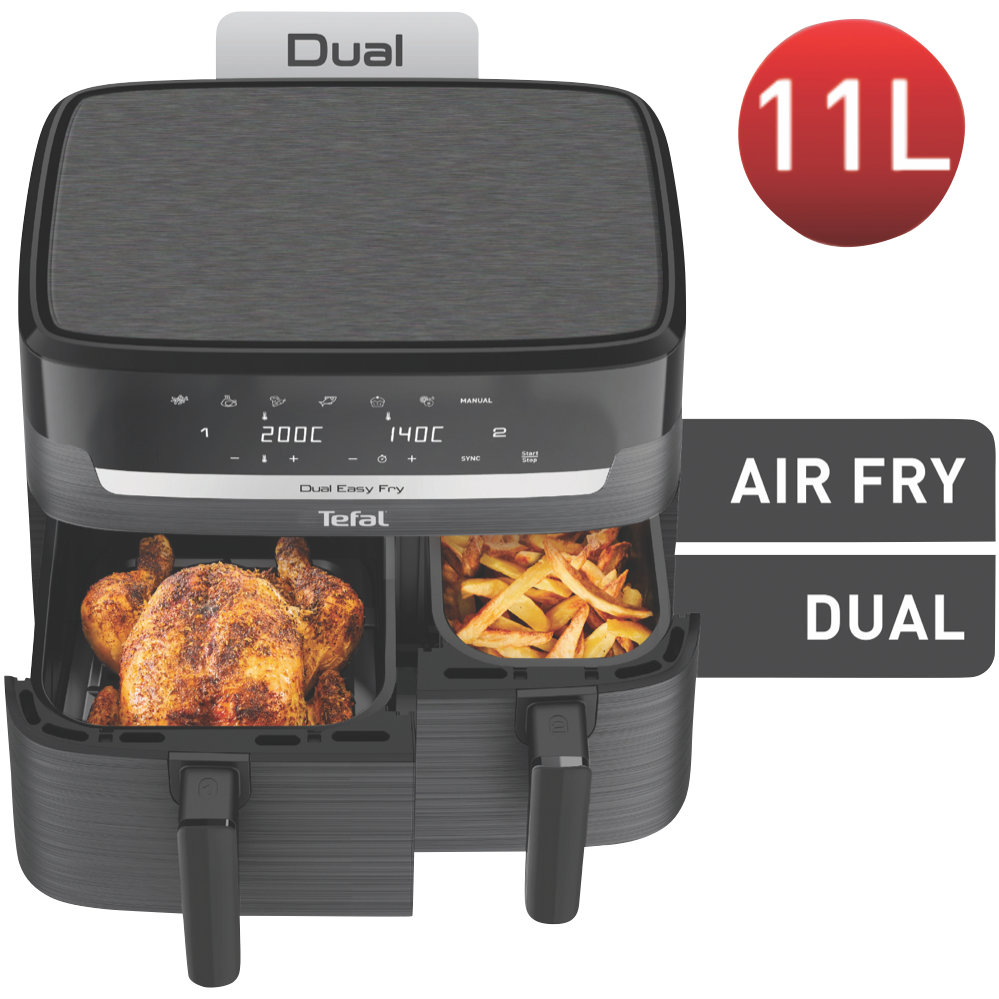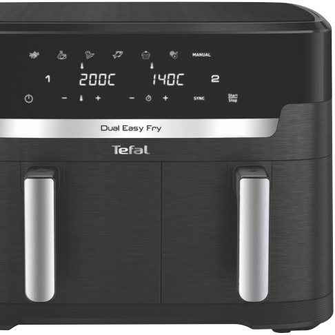 Want to cook multiple dishes at once without the hassle? The Tefal XXXL Dual Easy Fry Air Fryer is your kitchen helper. With two separate cooking zones you can whip up a main and side dish simultaneously. The 11-litre total capacity (6.5L and 4.5L drawers) is perfect for solo meals or family feasts. Set the temperature between 40°C and 200°C and let the 7 automatic programs take care of the cooking. The digital controls make it easy to use and the 60-minute timer ensures nothing gets overcooked. Plus the extra crispy technology gives your food that perfect crunch. When you're done just pop the removable parts in the dishwasher. It's cooking made simple with less fuss and more flavour. The Tefal XXXL Dual Easy Fry Air Fryer model number EY9428 is ready to transform your meal prep.
