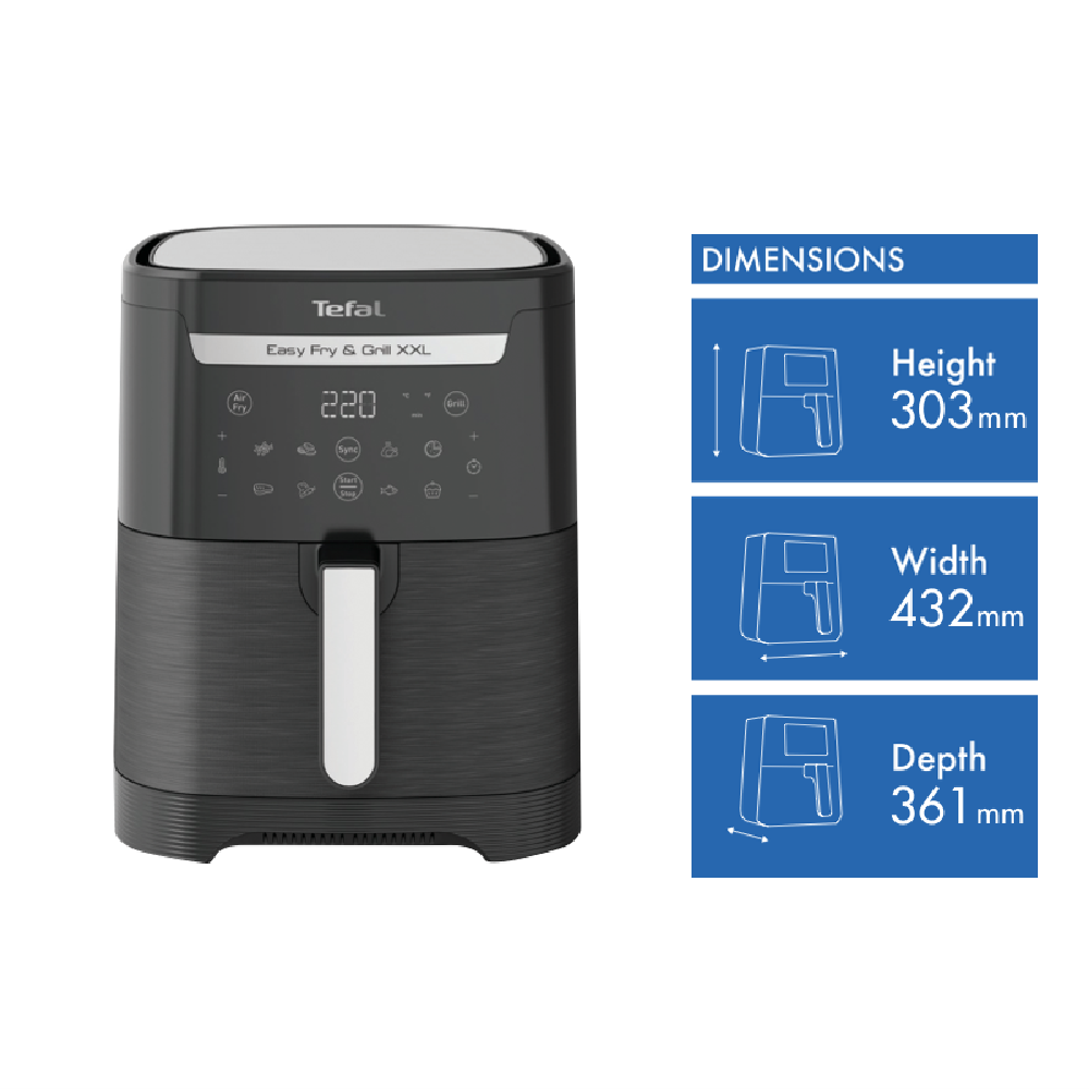 Cook multiple foods your way with this Easy Fry And Grill XXL Flexcook Air Fryer. Its generous 6.9L capacity lets you prepare meals for the whole family while the removable Flexcook divider gives you flexibility to cook two different foods simultaneously or use the full drawer. With eight preset programs including Fries Nuggets Roasted Chicken and Pizza meal preparation is simple using the touch controls. The die cast aluminium grid grill is non-stick and smokeless making cleanup easy - plus both the drawer and accessories are dishwasher safe. Temperature ranges from 40-200°C to handle everything from gentle warming to crispy frying. Comes with a 1 Year Warranty. Model EY8018.