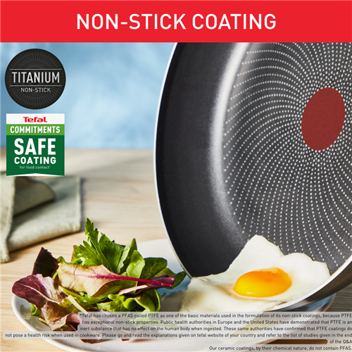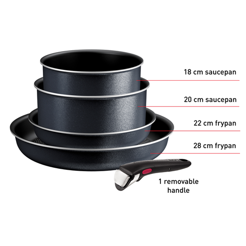 Looking for cookware that makes everyday meals easier and more enjoyable? This black pan set features a non-stick titanium coating so you can cook with less oil and clean up in a flash. The removable handle lets you switch between pans and the 3-point safety system gives you peace of mind while you cook. Because they heat up quickly and work on induction cooktops you can get dinner on the table sooner. The set includes two frypans two saucepans and a removable handle all designed for heavy-duty use. Backed by a two-year warranty for added confidence. Model L7239523. Give your kitchen a handy upgrade with this versatile pan set.
