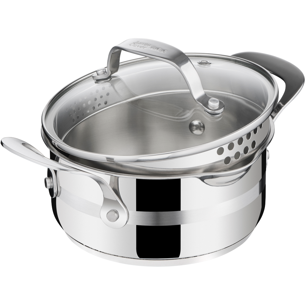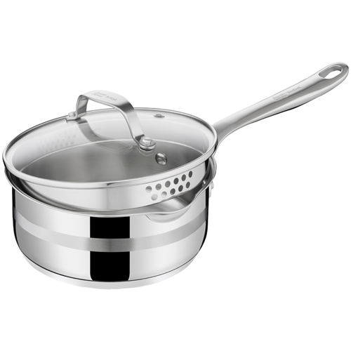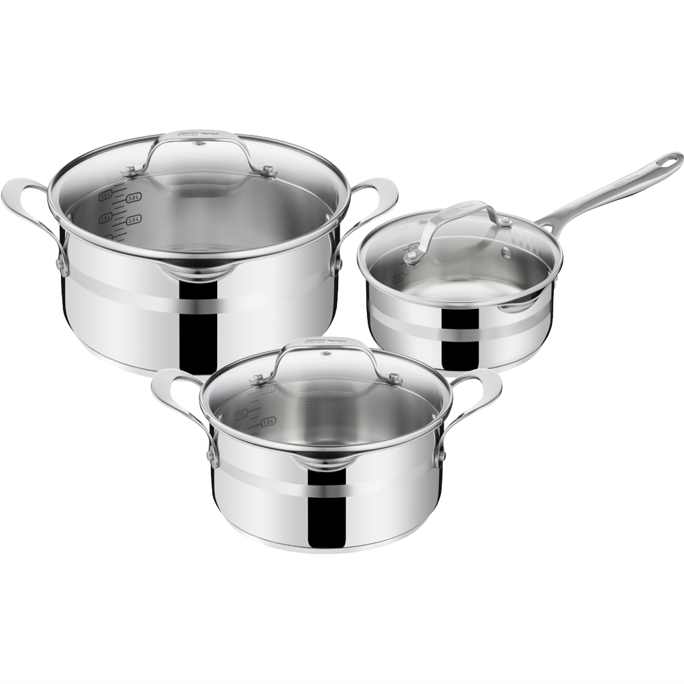 Looking for cookware that makes everyday meal prep easier? This three-piece silver pan set brings together sturdy 18/10 stainless steel construction with non-stick surfaces so you can enjoy reliable performance and quick clean-up. Each pot comes with a glass lid letting you keep an eye on your cooking while the riveted handles offer a safe and comfortable grip as you move around the kitchen. Measurement indicators inside the pans help you follow recipes more precisely and the pouring spouts with drainage holes in the lids make draining pasta or veggies simple. Because these pans are induction compatible and oven-safe up to 250 degrees you can use them for a wide range of recipes. The set includes a 16 centimetre saucepan with lid and two stewpots with lids sized at 20 and 24 centimetres so you have options for different meals. Backed by a two-year warranty and designed to last this set is a handy addition to your kitchen. Model E311S674.