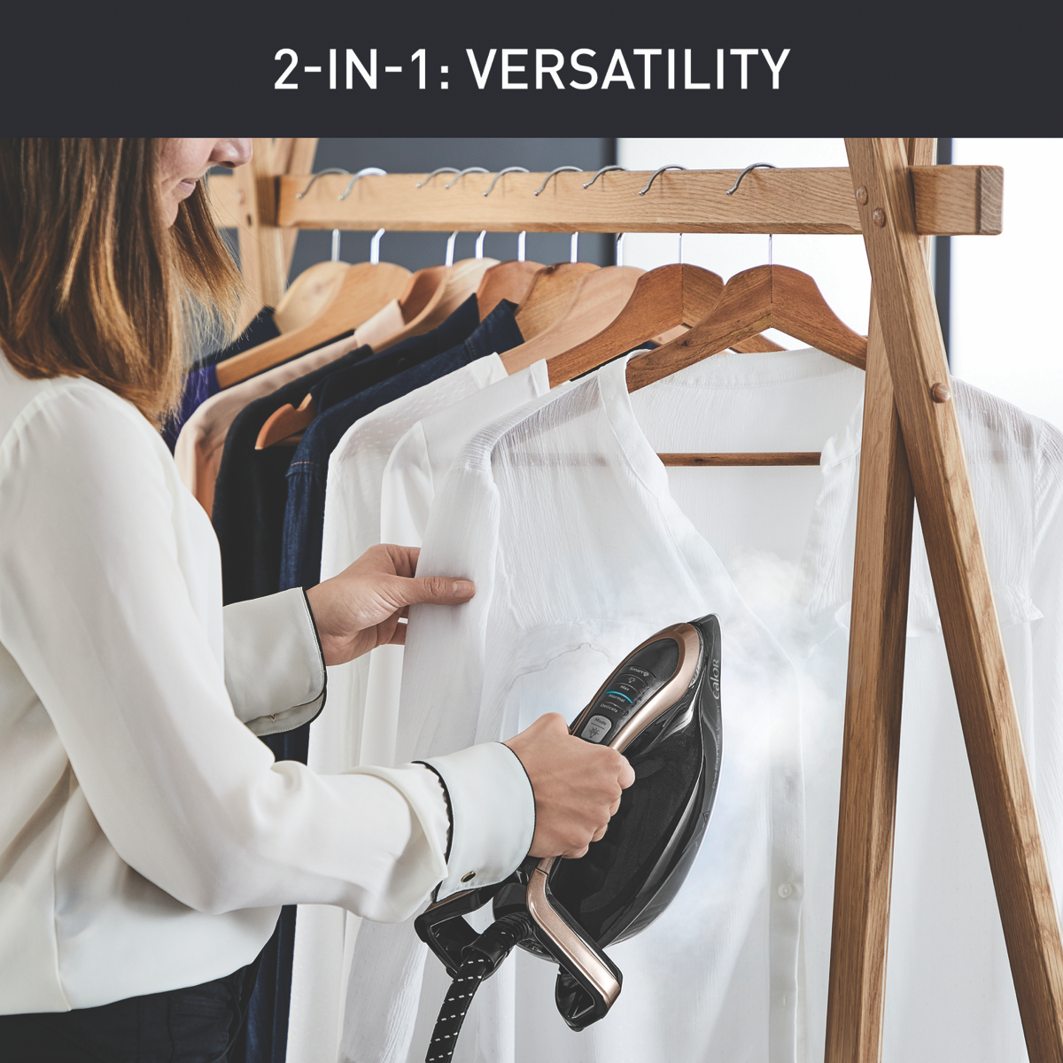 Say goodbye to ironing hassles and hello to perfectly pressed clothing with the Tefal Pro Express Vision steam generator. This powerful steam station iron makes quick work of stubborn wrinkles thanks to its high steam output of up to 140 grams per minute and 8 bars of pump pressure. The durable Durilium AirGlide soleplate effortlessly glides over all fabrics while the removable 1.8 liter water tank allows continuous steam. Smart features like the LED vision light and self-cleaning system ensure optimized performance. With the Tefal Pro Express Vision you'll achieve flawless results every time. Rest assured this steam generator iron comes with a 2 year manufacturer's warranty and Tefal's trusted reputation for quality. For easier ironing sessions upgrade to the ultimate steaming experience with Tefal's Pro Express Vision.