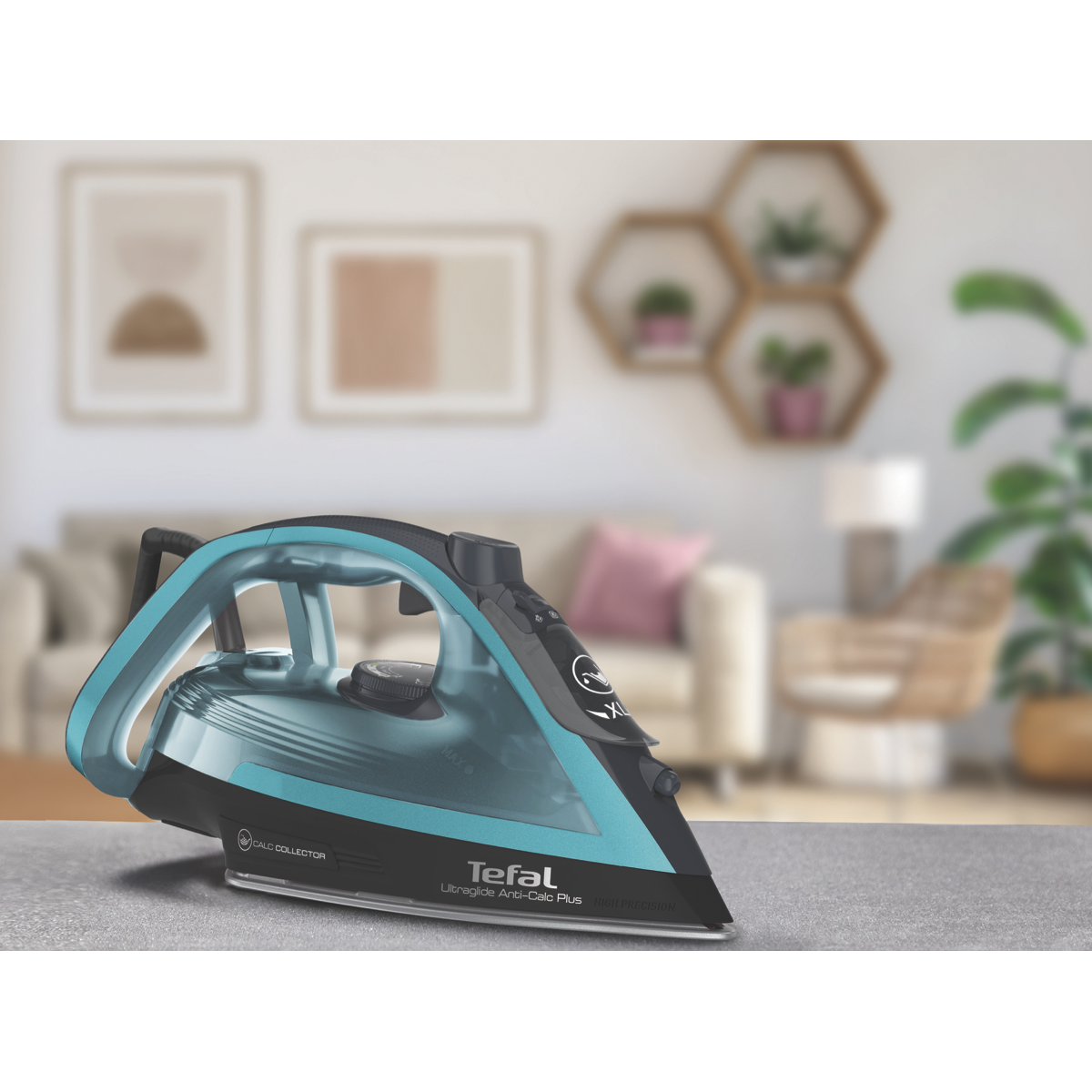 Glide into effortless ironing with the Tefal UltraGlide Anti-Calc Plus. This sleek black and crystal iron makes light work of wrinkles with its powerful 2400 watt Durilium Airglide soleplate that delivers smooth 45g/min of continuous steam. Blast through stubborn creases with the 185g/min steam shot and vertical steam and spray functions. The large 270ml water tank allows longer ironing sessions while the anti-drip and anti-calc features keep things mess-free. Auto shut off provides safety and peace of mind. With a 2 meter cord length and compact 1.59kg body the Tefal UltraGlide Anti-Calc Plus offers exceptional performance convenience and versatility. Experience the difference an advanced steam iron can make in your ironing routine. The manufacturer's part number for this product is FV5873. Find your flow with the Tefal UltraGlide Anti-Calc Plus today.