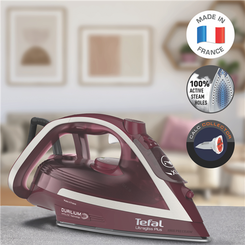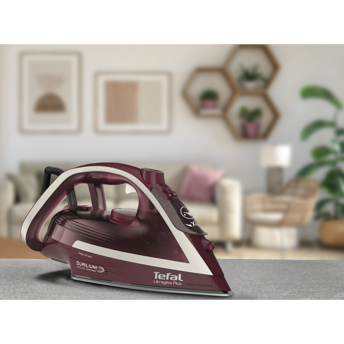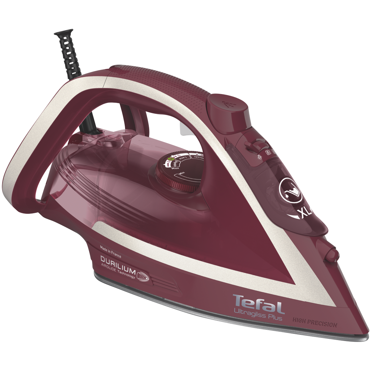 Step into the future of ironing with the Tefal UltraGliss Anti-Calc Plus Steam Iron. This innovative iron makes light work of removing wrinkles thanks to its powerful 2400W performance and continuous 50g/min steam output. The Durilium Airglide soleplate combines non-stick coating with air cushion technology for exceptional gliding and snag-free ironing. With a large 270ml water tank vertical steaming and 205g steam boost this iron tackles even the toughest creases with ease. Auto shut-off provides safety and peace of mind. Weighing just 1.295kg the ergonomic design offers comfortable extended use. This 2 meter cord iron comes in a stylish Gamay and Silver colorway. Additional features include a spray function for dampening fabrics. Made in France the manufacturer's part number for this product is FV6845. Discover the joy of effortless ironing with the Tefal UltraGliss.