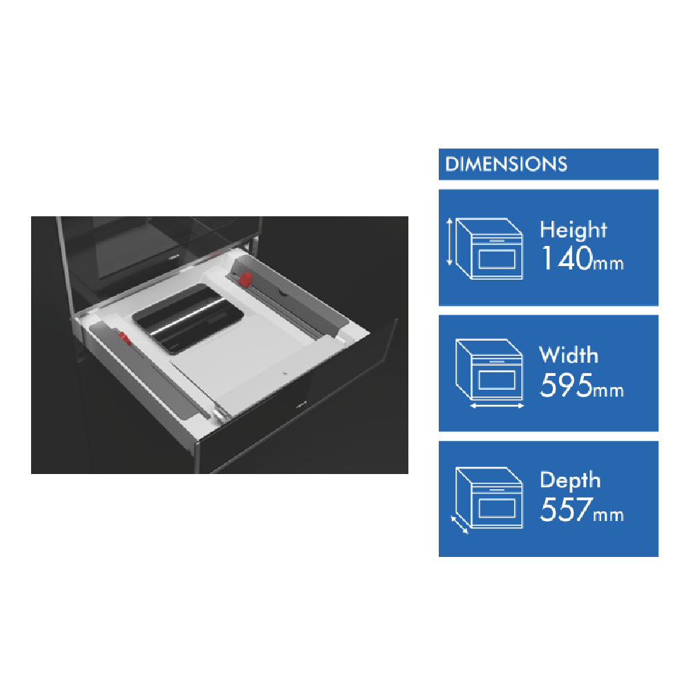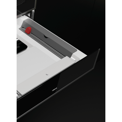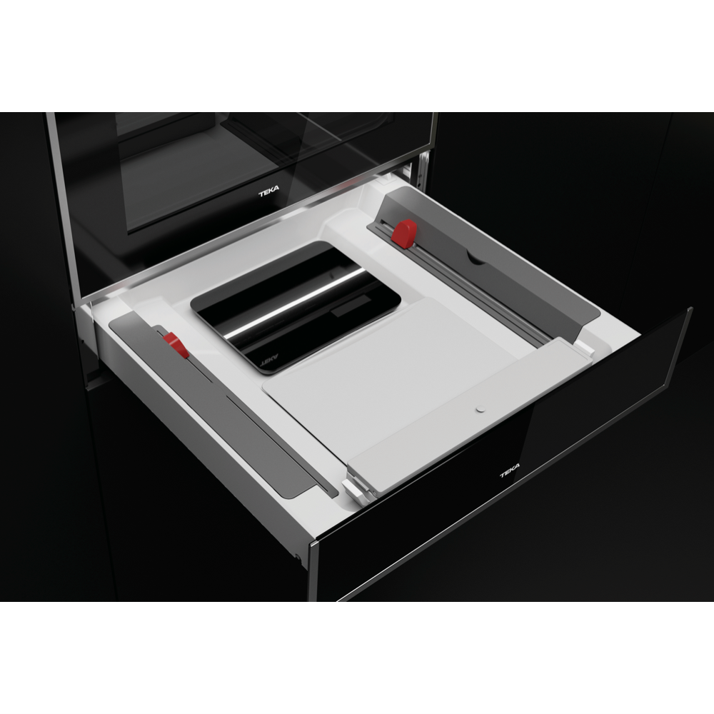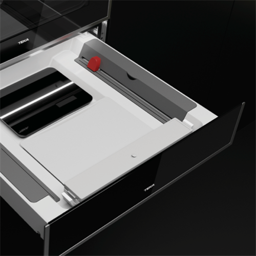 Complete your kitchen with the Teka 60cm Vacuum Sealer VS 152GS. A built-in kitchen scale with a protective cover allows you to weigh out your portions before sealing them. Roller holders with cutters on either side of the drawer for aluminium film and transparent film give extra storage space as well as an area to store accessories. The self-closing soft close drawer makes this vacuum drawer comfortable to use. The black glass finish matches Teka ovens and compacts so this vacuum sealer can add a finishing touch to your kitchen.