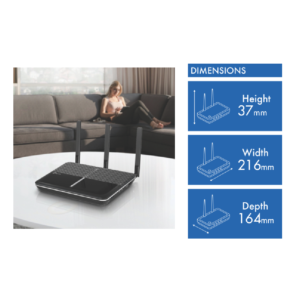 • Wi-Fi modem router with WiFi 5 802.11ac, up to 1733 Mbps