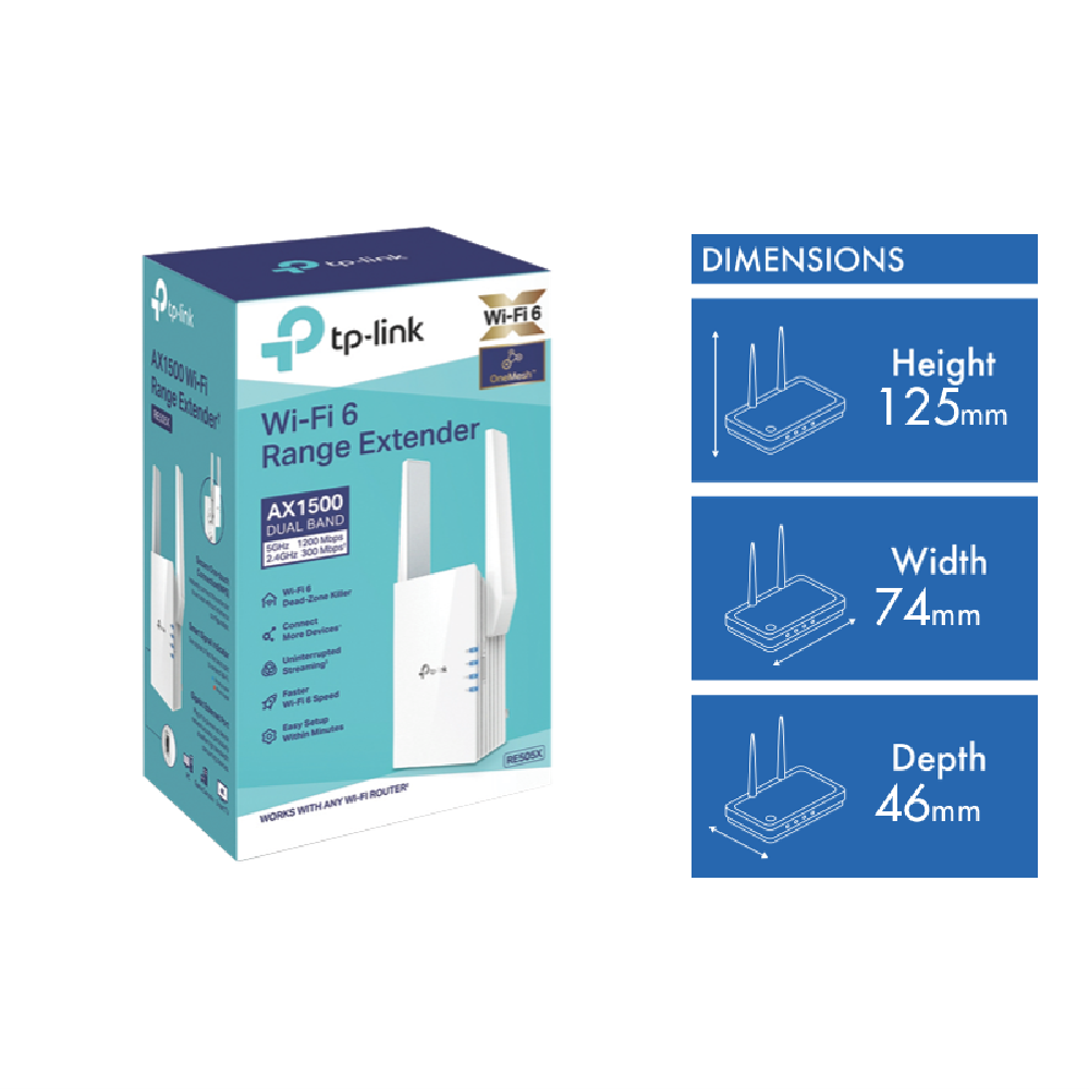 • Range extender with WiFi 6 802.11ax, up to 1.5Gbps speeds