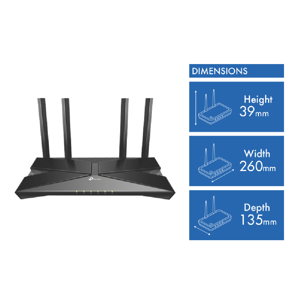 Upgrade your home Wi-Fi network with the TP-LINK AX1500 Wi-Fi 6 Router. This powerful black router delivers blazing fast wireless speeds up to 1.5Gbps and seamless coverage throughout your home thanks to innovative Wi-Fi 6 technology. With four fixed external antennas and a 1.5GHz triple-core processor experience dramatically reduced lag and buffering as you stream HD videos game online video conference and connect multiple devices at once. It also provides advanced security protocols like WPA3 to keep your network safe. Key features include dual-band connectivity four Gigabit LAN ports useful parental controls Alexa voice control compatibility and a hassle-free set-up. Designed for Australian homes this future-proof router brings you the latest wireless standard for faster speeds and greater capacity compared to Wi-Fi 5. Upgrade your wireless network today with the Archer AX10 for a reliable secure and lightning-fast connection. The manufacturer's part number for this product is ARCHER AX10. Check out the TP-LINK AX1500 Wi-Fi 6 Router to boost your home's Wi-Fi performance.