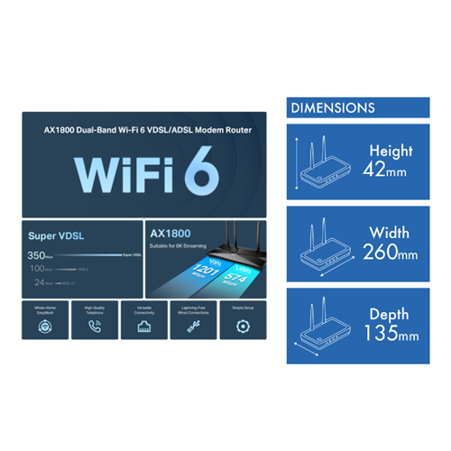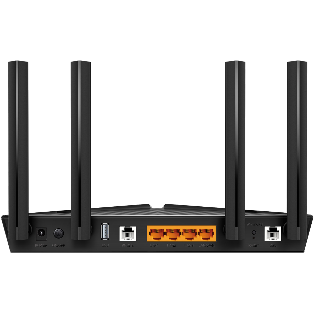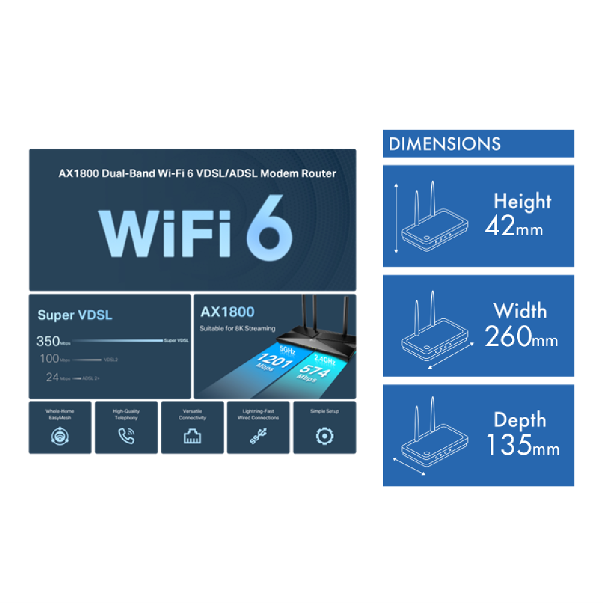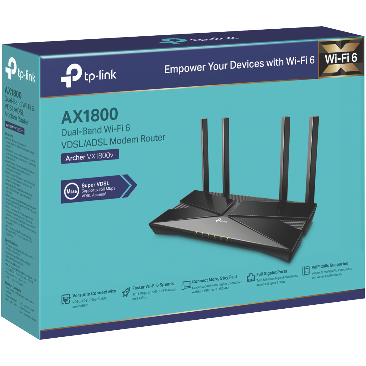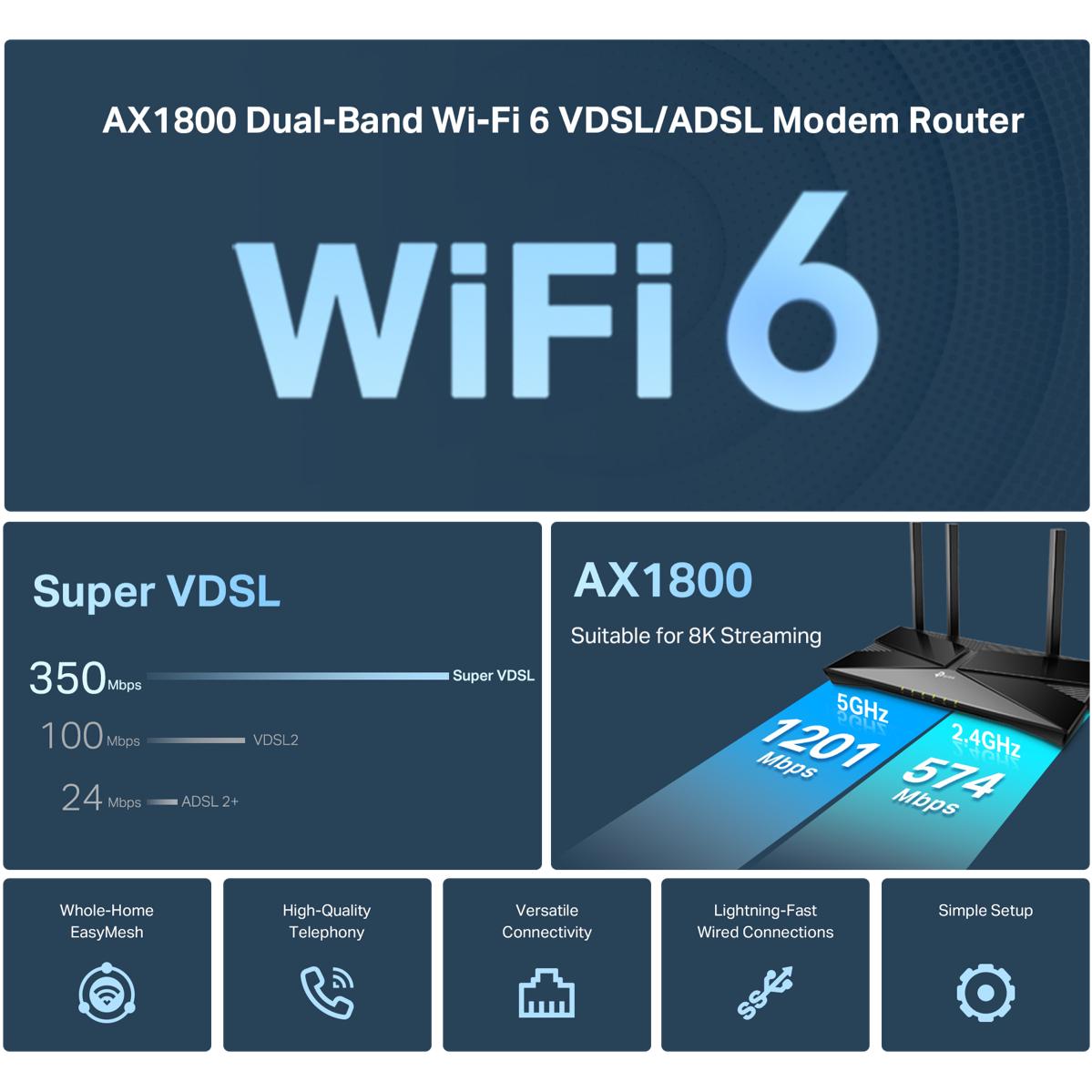 Transform your home network with the TP-LINK AX1800 Dual-Band Wi-Fi 6 VDSL/ADSL Modem Router. This versatile black modem router delivers blazing fast wireless speeds keeping all your devices connected. With Wi-Fi 6 technology experience reduced lag and faster response times when gaming online video chatting or streaming movies in 4K. Four external antennas expand your Wi-Fi coverage throughout your home while the powerful 1.5GHz dual-core processor ensures peak performance. Connect via Wi-Fi or plug your devices directly into one of four Gigabit Ethernet ports. With built-in VDSL/ADSL modem and WAN/LAN ports this router handles fibre cable DSL and 4G LTE internet connections. Manage your network security with a firewall and VPN server. Create a mesh network access media files and share a printer using the USB port. Designed to be quick and easy to setup this TP-LINK modem router also allows flexible control through the Tether app. Covered by a 3 year manufacturer's warranty the TP-LINK AX1800 Dual-Band Wi-Fi 6 VDSL/ADSL Modem Router upgrades your network to the latest Wi-Fi technology. The manufacturer's part number for this product is ARCHER-VX1800V. Discover the possibilities of fast reliable Wi-Fi throughout your home with this versatile modem router.
