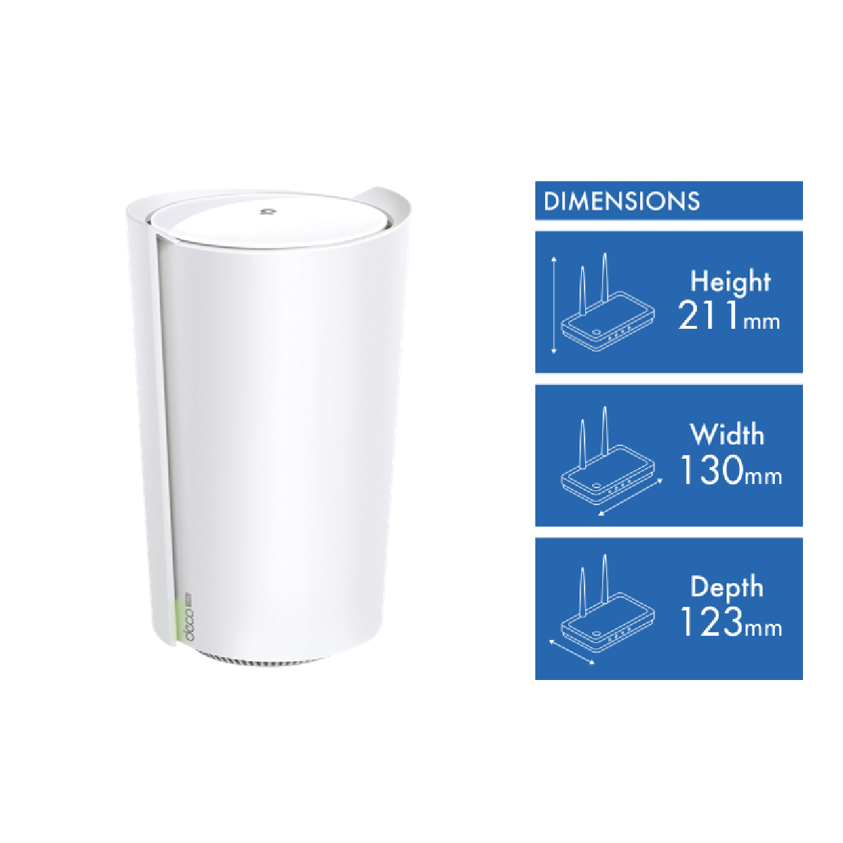 Data Transfer Speed 5 GHz: 1201 Mbps (802.11ax) 2.4 GHz: 574 Mbps (802.11ax), 4%26#215; Gigabit Ports Per Deco X73-DSL Unit, 2%26#215; Gigabit Ports Per Deco X73 Unit, 4%26#215; Gigabit Ports Per Deco X73-DSL Unit, 2%26#215; Gigabit Ports Per Deco X73 Unit