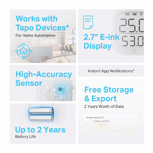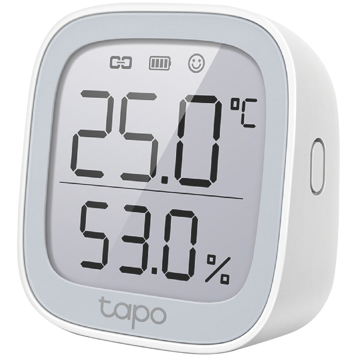 Keep your home's temperature and humidity in check with the TP-LINK Smart Temperature & Humidity Monitor. This sleek white sensor allows you to monitor indoor conditions remotely via the Tapo app compatible with both Google Assistant and Amazon Alexa for handy voice control. With a compact 46mm x 46mm x 12.3mm design the monitor blends into any space while providing accurate readings viewable on your smartphone. Equipped with convenient adhesive strips and magnets mounting the device is a breeze. Powered by two AAA batteries the monitor offers cable-free convenience. By tracking temperature and humidity 24/7 you can ensure your home environment stays at comfortable levels. The included one year warranty provides peace of mind. The manufacturer's part number for this product is TAPO-T315. Bring smart home convenience to your indoor climate monitoring with the TP-LINK Temperature & Humidity Monitor today.