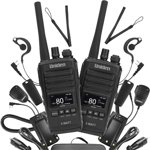Stay connected on your adventures with the Uniden UH755-2DLX UHF CB Handheld Radio Twin Pack. With a range of up to 17 kilometers you can keep in touch whether you're hiking camping or just exploring the great outdoors. The long-lasting lithium-ion batteries provide up to 35 hours of use on a single charge so you won't have to worry about running out of power. This twin pack comes with everything you need including antennas a desktop charging cradle AC adaptors belt clips wrist straps earpiece mics speaker mics cig-lead adaptors and a handy soft carry case. Plus enjoy peace of mind with Uniden's 3-year manufacturer's warranty. Part number: UH755-2DLX.