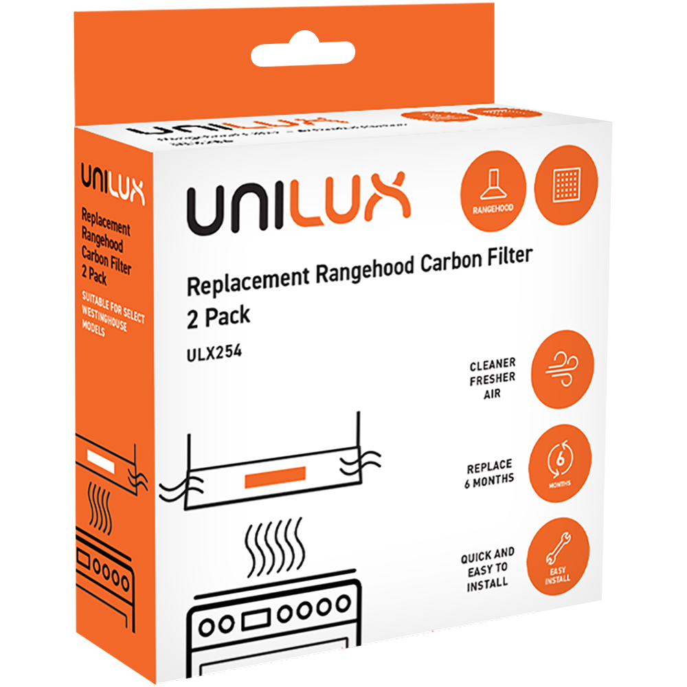 Keep your rangehood working efficiently with this 2-pack of carbon filters. These replacement filters trap cooking odours and airborne grease particles helping maintain cleaner air in your kitchen. They're easy to install and fit a range of standard models so you won't need to struggle with complicated replacements. The carbon material effectively absorbs cooking smells which means your kitchen stays fresher longer. Backed by a 1-year warranty. Model ULX254.