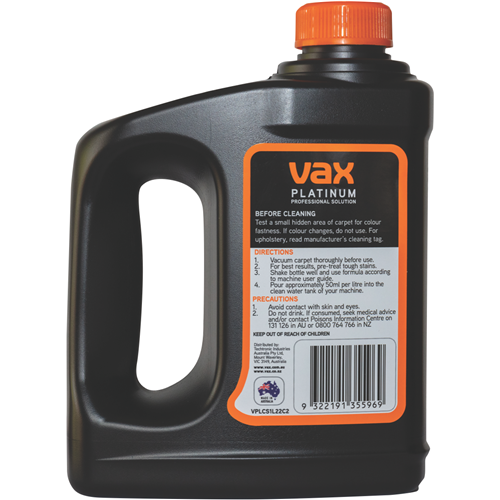 Eliminate stubborn carpet stains with the powerful Vax Platinum Carpet Solution. This advanced formula tackles even the toughest stains like red wine coffee and grease leaving your carpets looking clean and fresh. The active cleaning agents penetrate deep into carpet fibers lifting away dirt debris and stains with ease. Suitable for use with Vax's VX97 and VX100 carpet cleaning machines this versatile cleaner is safe for all carpet types. The 1 litre bottle provides enough solution to tackle multiple rooms so you can give your whole home a deep clean. Simply fill the cleaning machine apply the solution and watch as it goes to work dissolving stains.With Vax's Platinum Carpet Solution you can finally say goodbye to unsightly marks and revive the look of your carpets. Your floors will be revived and restored to their original beauty. Give your carpets the care they deserve with this hardworking stain remover.The manufacturer's part number for this product is VPLCS1L22C2. Revitalise your carpets today with the Vax Platinum Carpet Solution.