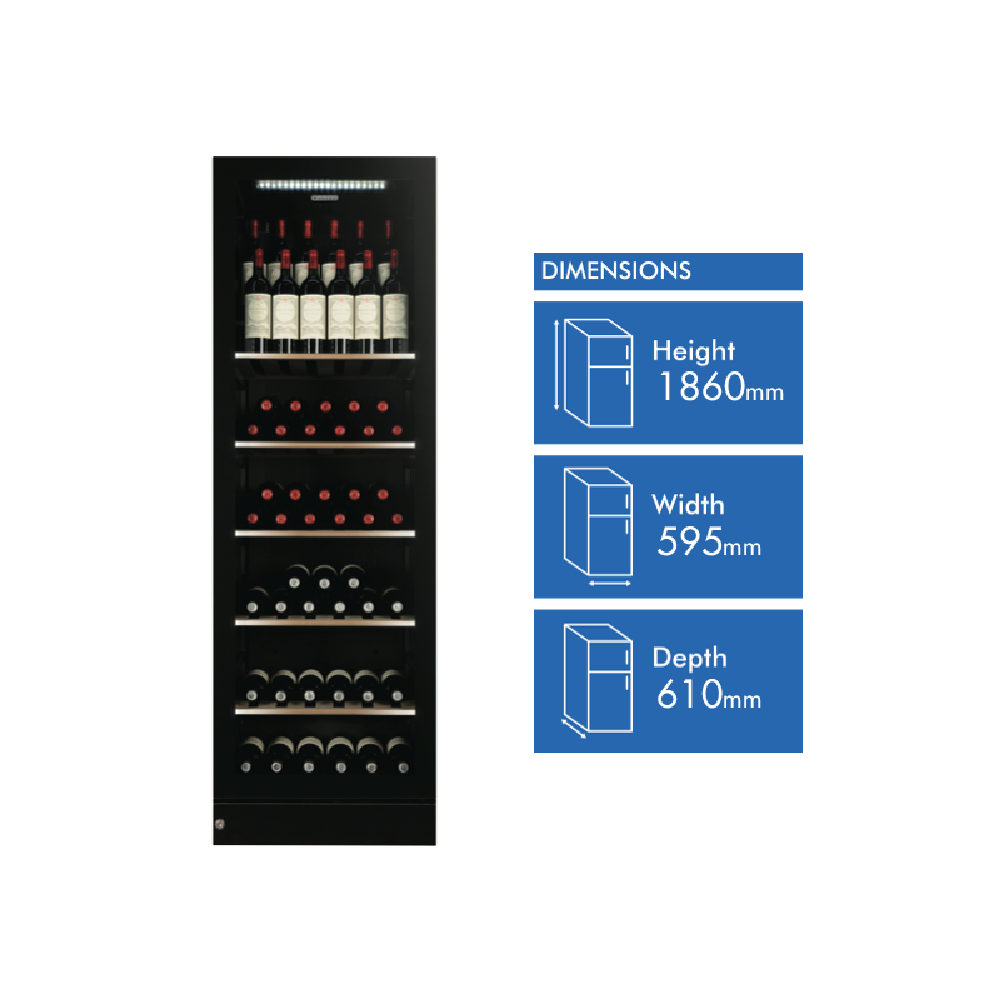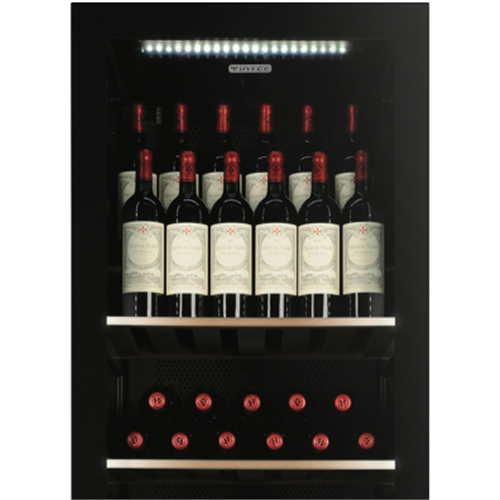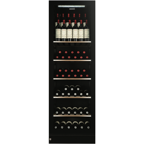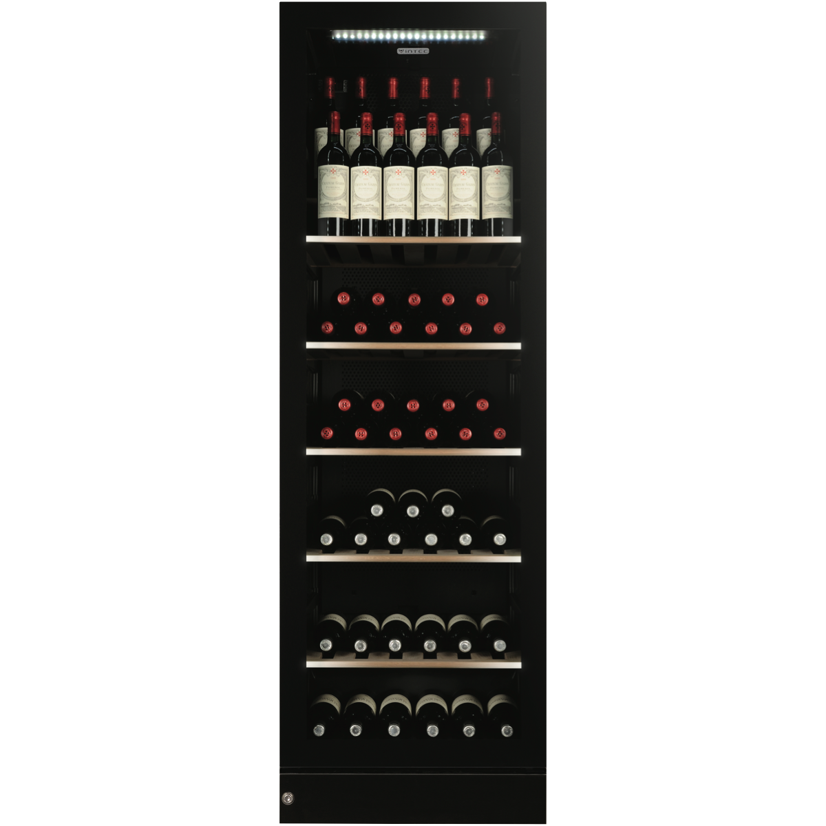 Keep your fine wines at their best in this sleek black wine cabinet from Vintec. With space for up to 170 bottles behind a stylish right-hinged door this cabinet lets you create the perfect conditions for long-term storage or short-term serving. An adjustable thermostat provides precise temperature control between 6 and 22°C across single or multi zones. Whether you're cellaring prized vintages or chilling whites and rosés the insulated body maintains your chosen climate while protecting bottles from UV light. Shelves slide out for easy access and an interior light illuminates your collection. Quiet operation and energy-efficient design make this freestanding model an excellent addition to cellars kitchens and entertainment areas. With a 2 year warranty from Vintec you can store and serve with confidence. The manufacturer's part number for this product is V190SG2E-BK. Bring home compact wine storage that keeps valued bottles in peak condition.