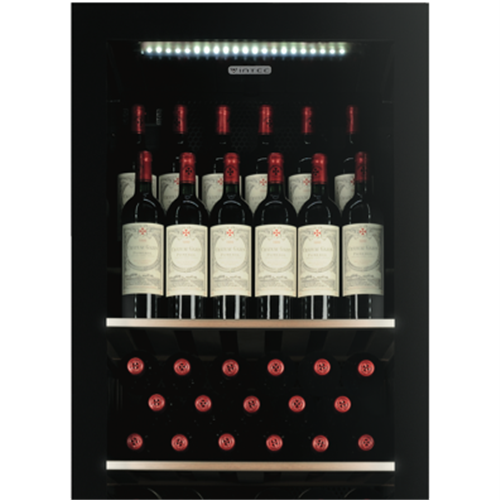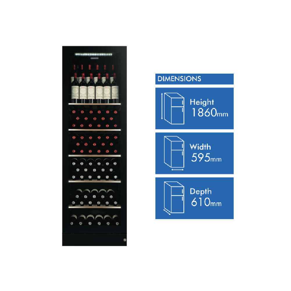 Elevate your wine preservation with the sleek Vintec 170 Bottle Wine Cabinet. This freestanding single temperature zone wine fridge comes in a stylish black finish with a left hinge door that opens to reveal space for 170 of your favourite bottles. Maintaining temperatures between 6 and 22 degrees Celsius this cabinet creates the perfect environment for both red and white wines. The 595mm width and 600mm depth allow you to store all your prized bottles while fitting neatly into tight spaces. With adjustable shelving slide-out shelves and soft LED interior lighting you can easily view and access your collection. The built-in fan circulation system maintains a consistent temperature throughout while minimizing vibration and noise. Enjoy peace of mind with the included 2 year manufacturer's warranty. The manufacturer's part number for this product is V190SG2E-BKLH. Give your wine the love it deserves with the Vintec 170 Bottle Wine Cabinet today.