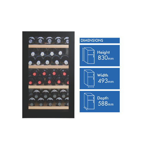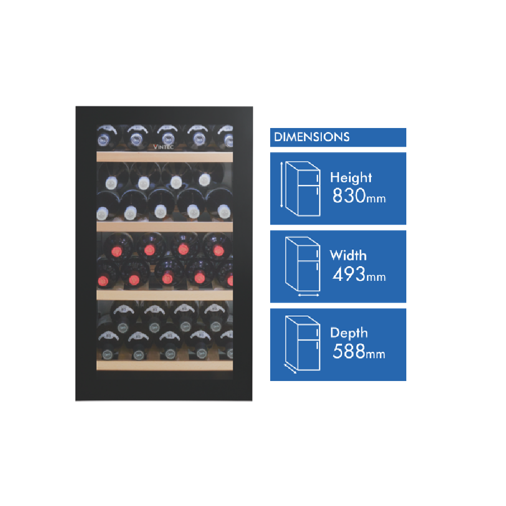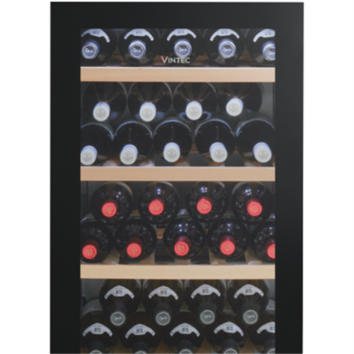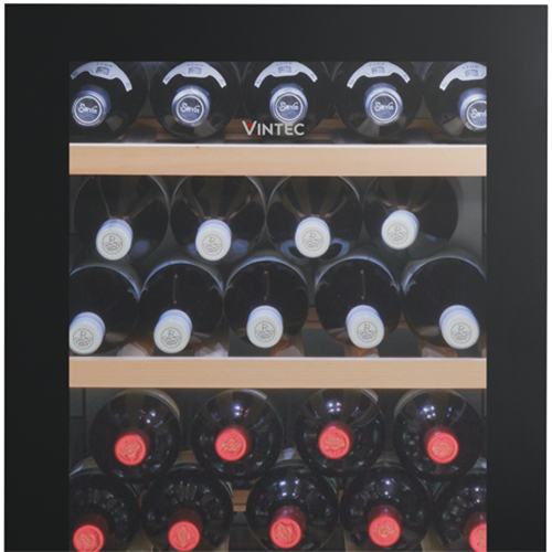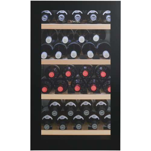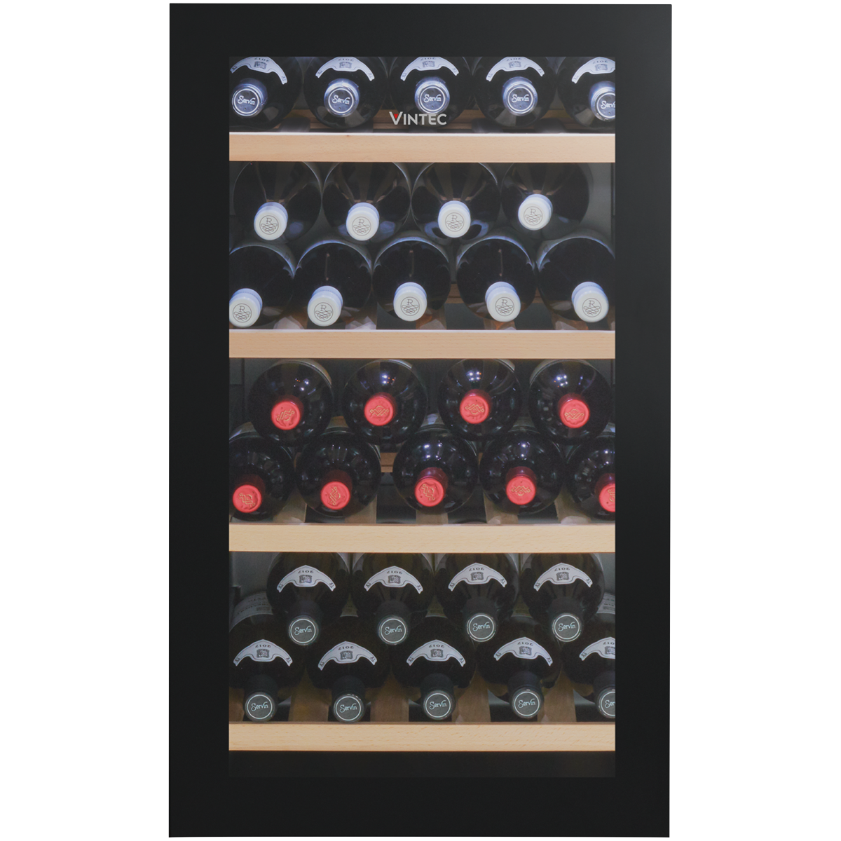 Step into a wine lover's paradise with the sleek black Vintec 35 Bottle Wine Cabinet. Designed to impress this freestanding wine fridge provides the optimal storage conditions for prized wine collections. Maintaining a constant temperature between 6-18°C this single temperature zone unit preserves wine quality and prevents spoilage. With a capacity of 35 bottles wine connoisseurs can store a diverse selection of reds whites and champagnes. The reversible right hand door hinge allows for flexible placement while the internal light illuminates bottles for display. Quietly running at less than 50 decibels this wine fridge enables discreet storage without disruptive noise. Measuring 493mm wide 830mm high and 588mm deep the compact Vintec Wine Cabinet fits in most spaces. Entertain guests in style by storing and serving wine at the ideal temperature in your home. The manufacturer's part number for this product is VWS035SBB-X. Impress your guests and keep your wine collection perfectly stored with the Vintec 35 Bottle Wine Cabinet today.