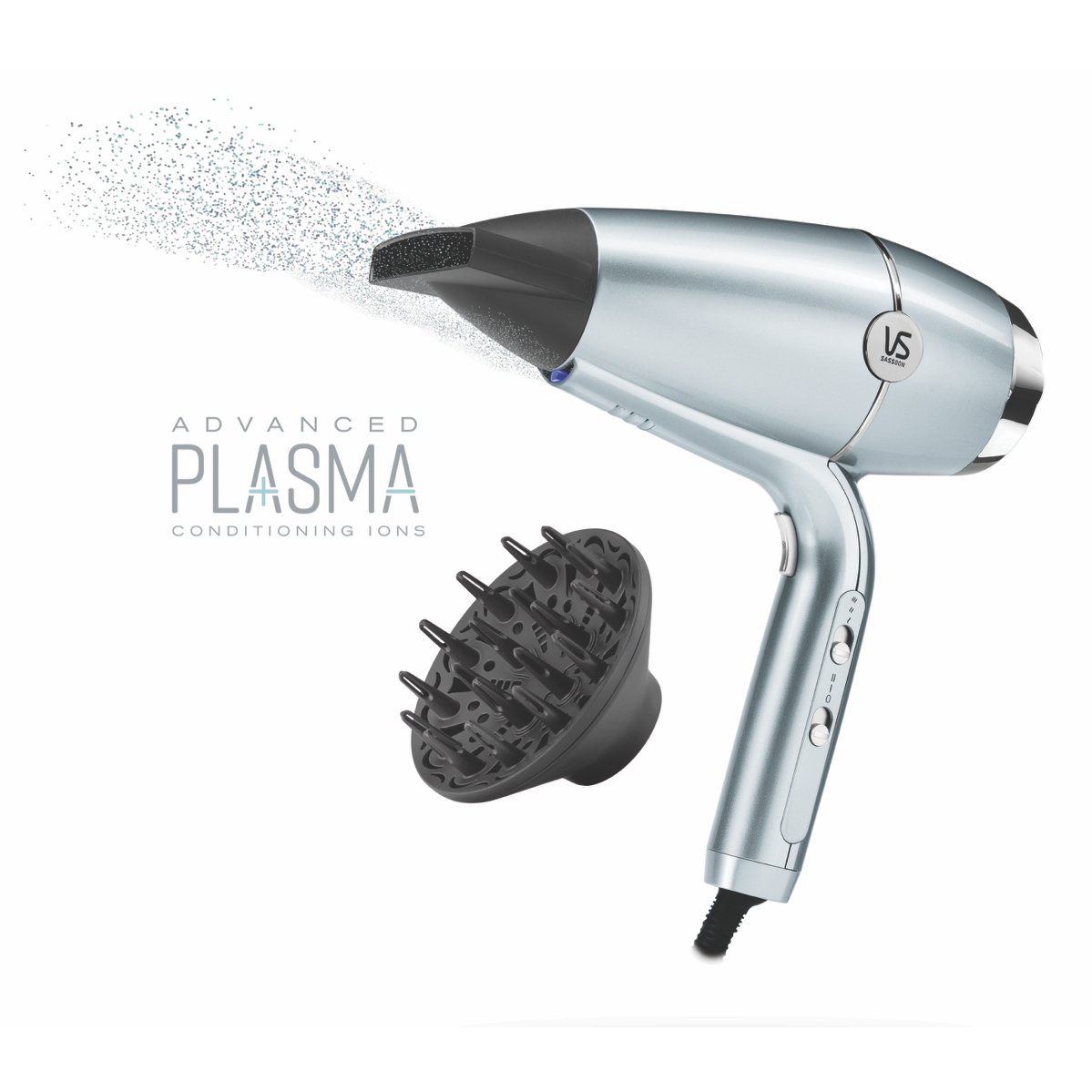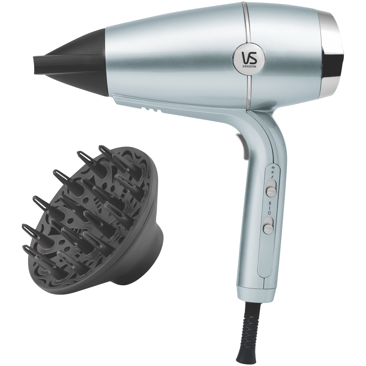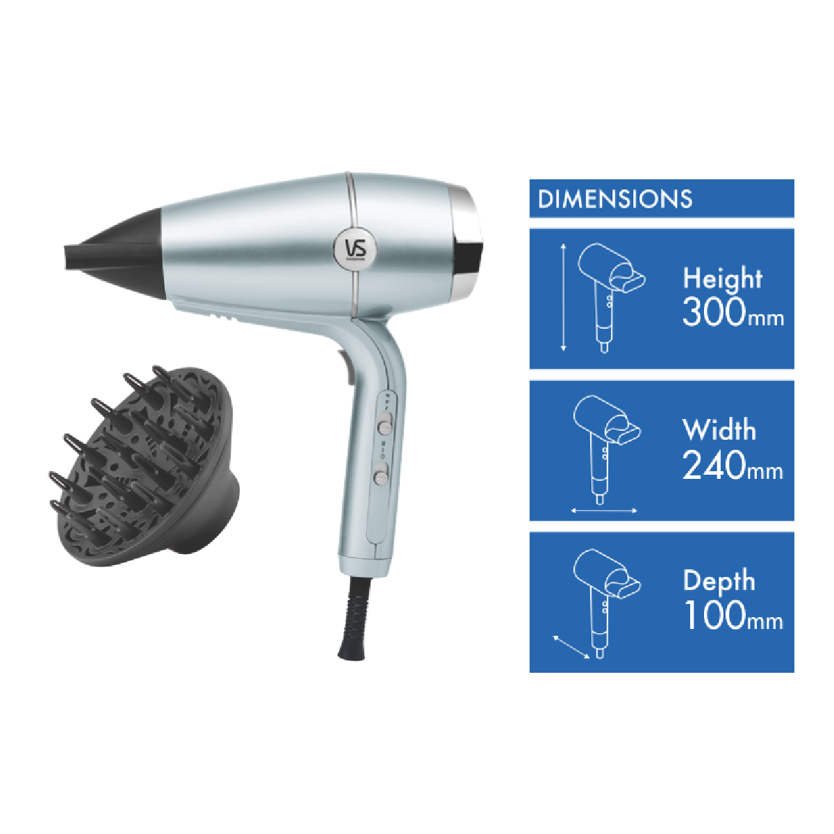 Tame those tresses in a flash with the VS Sassoon Hydro Smooth Fast Dry Hairdryer. This 2100W hair dryer features advanced plasma conditioning ions that smooth and condition hair while drying up to 95km/h for a salon-worthy blowout in record time. The ceramic technology and cool shot lock in your style while the 2 speed settings and 3 heat modes allow you to customize drying and styling. Weighing just 0.423kg the lightweight body and 2.5m cord provide flexibility and ease of use. The silver finish gives a sleek modern look. With its high torque DC motor and ionic conditioning this hairdryer delivers smooth frizz-free hair and dramatically cuts down drying time. Treat your locks to salon-quality results in the comfort of your own home. The manufacturer's part number for this product is VSD5573A. Check out the VS Sassoon Hydro Smooth Fast Dry Hairdryer today for a fast and flawless blowout.