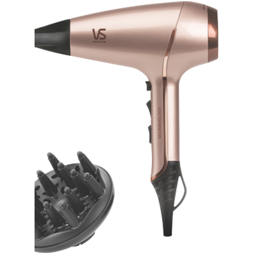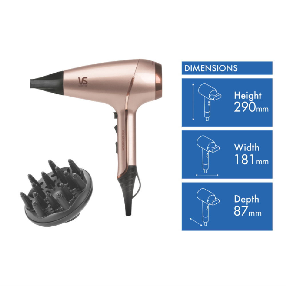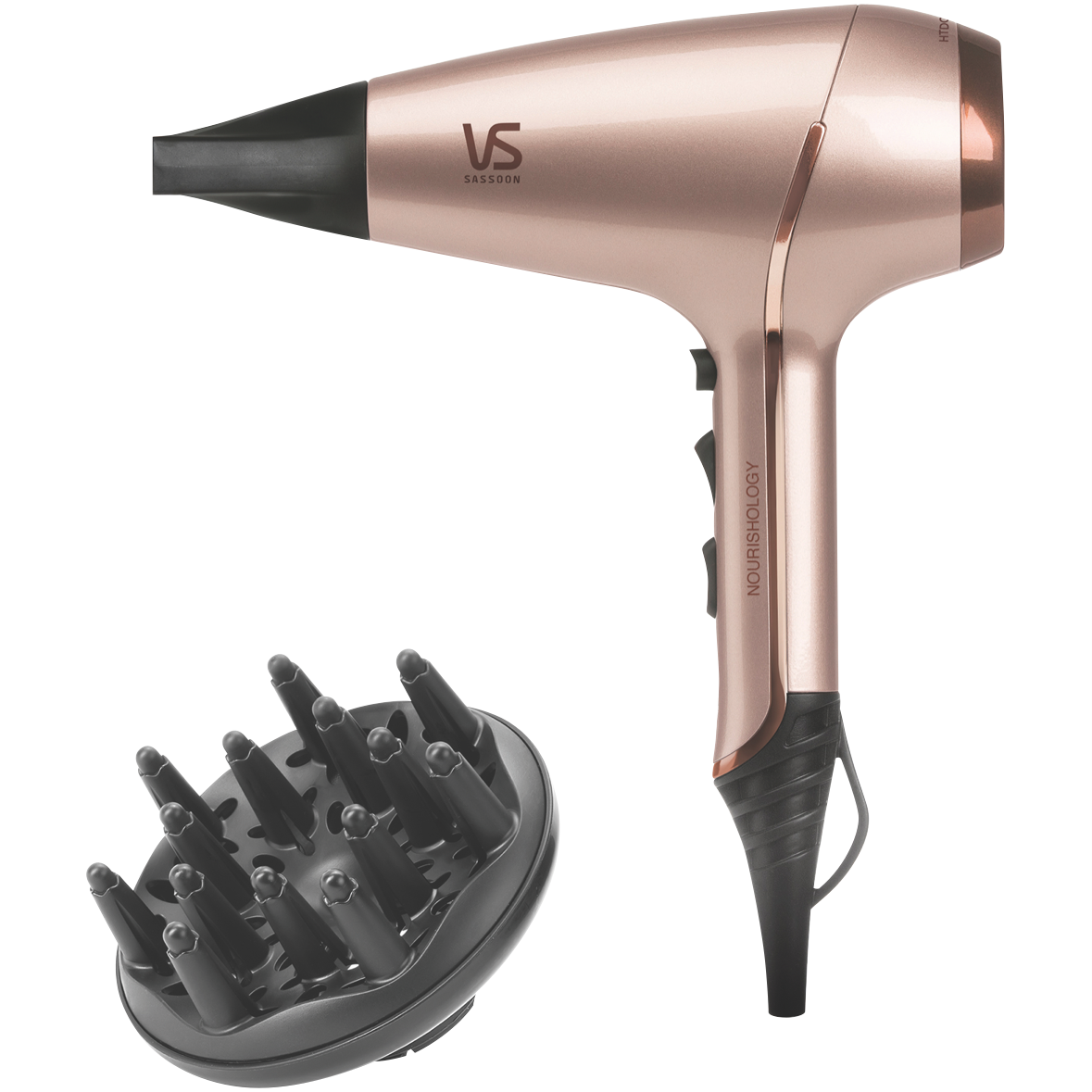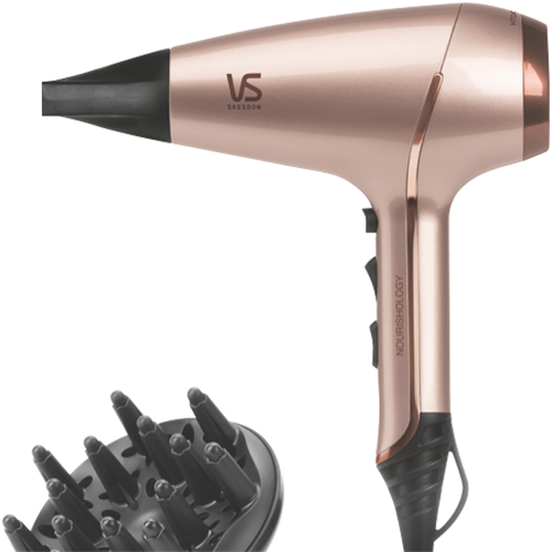 Breathe new life into your hair styling routine with the VS Sassoon Nourishingly 2200 Dryer. This copper-coloured dryer makes short work of blow drying thanks to its powerful 2200W motor and two speed settings. The advanced Micro-Infused Conditioning and Keratin Ceramic-Ionic technologies infuse and seal hair cuticles for smooth nourished strands. Three heat settings allow you to tailor the temperature to suit your hair type while the cool shot button sets your style. Weighing just 0.492kg the dryer is easy to handle and features a rear filter you can remove for hassle-free cleaning. Convenient storage is enabled by the hanging loop and the high torque DC fan generates airflow up to 105km/h for fast drying every time. With a 2 year manufacturer's warranty the VS Sassoon Nourishingly 2200 Dryer delivers salon-worthy results you'll love. Order yours today.