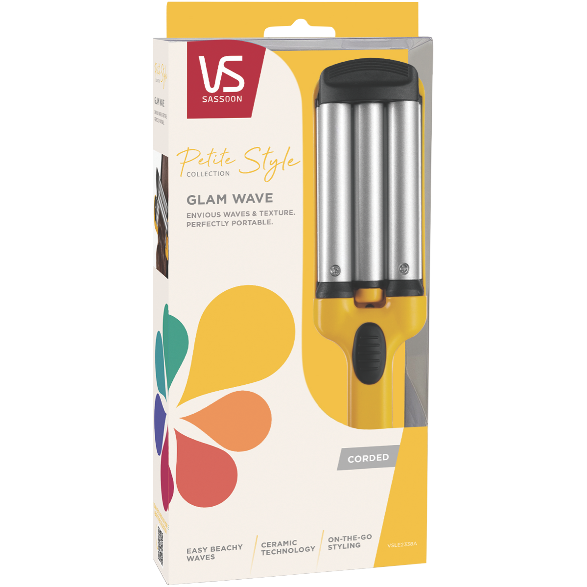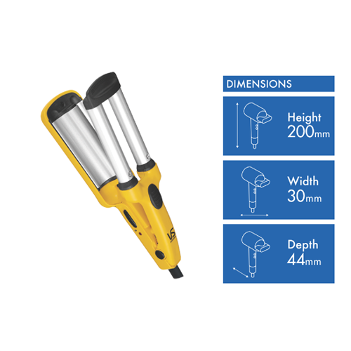 Immerse yourself in styling perfection with the petite VS Sassoon Glam Wave. This lightweight 185g hair styler features ionic conditioning and fast heat-up to 200°C for creating beautiful waves and curls on the go. The 13mm ceramic coated barrel minimises frizz and flyaways while the easy hold cool tip and thumb rest ensure maximum control and comfort. With worldwide voltage 2 year warranty and a sleek compact yellow design this Glam Wave is your new secret weapon for gorgeous hair anywhere. Achieve salon-worthy bounce and body in minutes with the versatile styling of the VS Sassoon Petite Glam Wave. The manufacturer's part number for this product is VSLE2338A. Add this essential styling tool to your collection today.