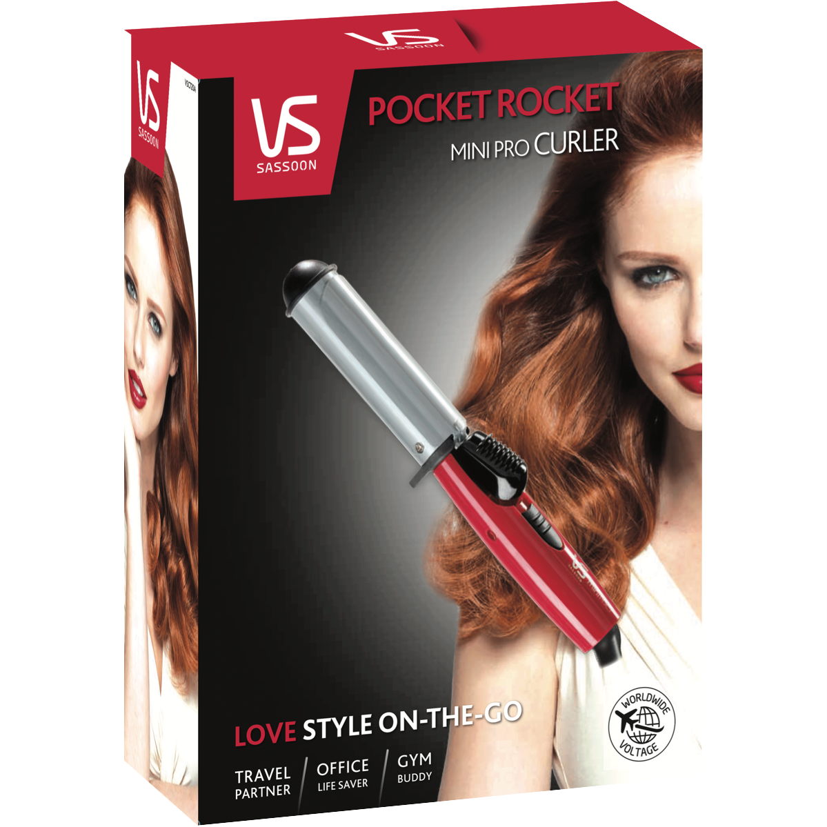 Get perfect curls on the go with the VS Sassoon Pocket Rocket Mini Curler. This compact curler features ceramic coated plates and ionic conditioning to help reduce frizz and add shine as you style. With quick heating up to 180°C 25mm barrel size and built-in stand you can create bouncy curls or loose waves in minutes. The swivel power cord prevents tangling while the 2 year manufacturer's warranty provides peace of mind. Crafted in a stylish red black and silver design this curler is the ideal travel companion for touch-ups and styling on the go. Achieve salon-worthy curls in a flash with the versatile easy-to-use VS Sassoon Pocket Rocket Mini Curler. The manufacturer's part number for this product is VSC720A. Check out this curler to add beautiful curls or waves to your look anywhere anytime.