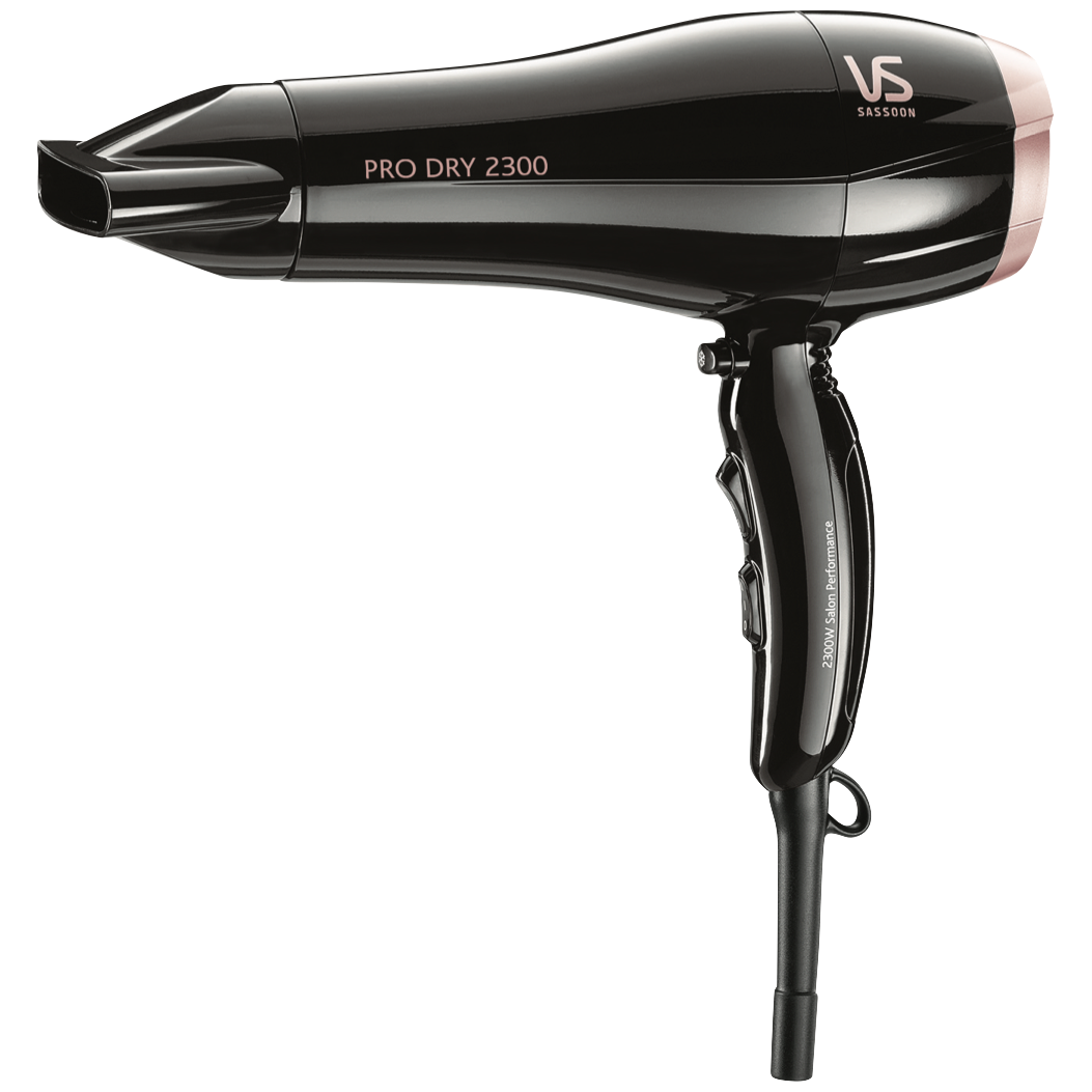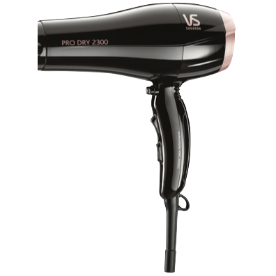 Dry your hair quickly and easily with the sleek VS Sassoon Pro Dry 2300 hair dryer. This powerful dryer features a 2300W motor and two speeds for maximum control and versatility when styling your hair. The lightweight design with hanging loop makes storage simple and the direct current motor and cool shot button help lock in your look. With 2300 watts of drying power this hair dryer makes short work of wet locks. The two speed settings allow you to adjust airflow for precision styling while the cool shot button sets your style for long-lasting results. Weighing in at just 0.445kg the ergonomic body is easy to maneuver and store thanks to the built-in hanging loop. Achieve salon-quality blowouts at home with this feature-packed VS Sassoon hair dryer. The manufacturer's part number for this product is VSD120A. Check out this hair dryer to upgrade your at-home styling routine today.