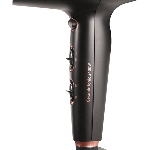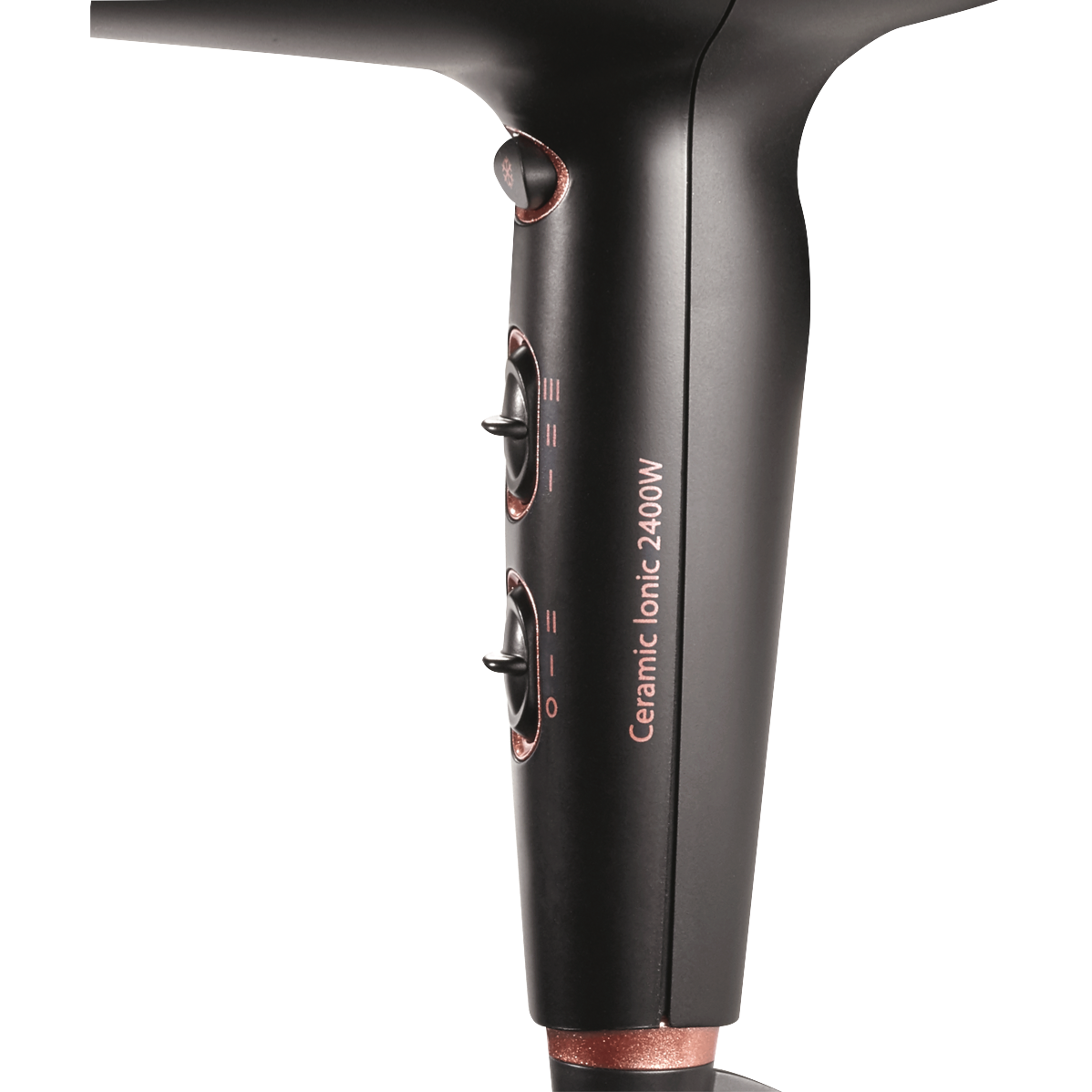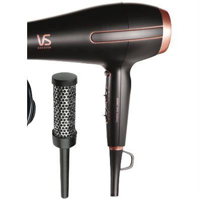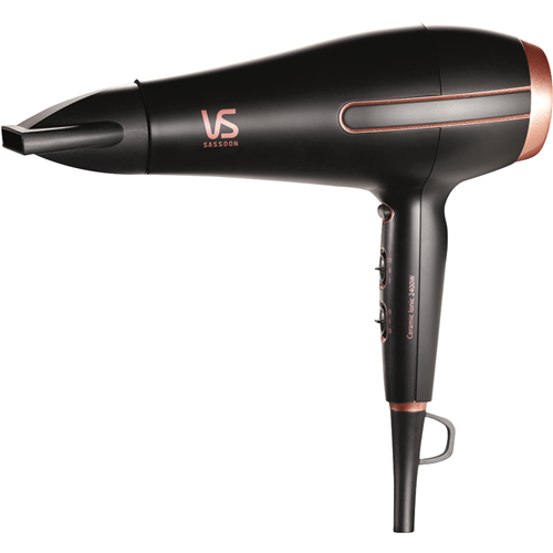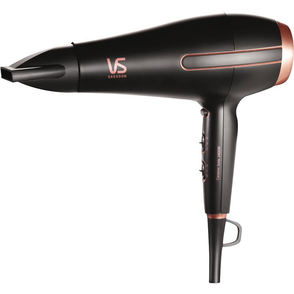Get salon-quality blowouts at home with the VS Sassoon Super Power 2400 Hair Dryer. This powerful 2400W dryer features a long-life salon grade motor to deliver hassle-free drying and styling. With two speed settings and three heat options including a True Cold Shot button you can achieve smooth frizz-free styles. The ionic conditioning and tourmaline minerals give hair a smooth shiny finish while reducing static. An extra-long 2.8m cord provides ease of use and flexibility. Weighing just 0.561kg it's lightweight and easy to handle. The Ceramic Technology ensures even heat distribution and fast drying. With a sleek black and bronze design easy storage hanging loop and 95km/h air speed this dryer makes styling quick and simple. Experience the convenience of salon-quality blowouts minus the hassle with the Super Power 2400 by VS Sassoon. Backed by a 2 year warranty for peace of mind. The manufacturer's part number for this product is VSD769A. Bring the power of the salon home with the VS Sassoon Super Power 2400.