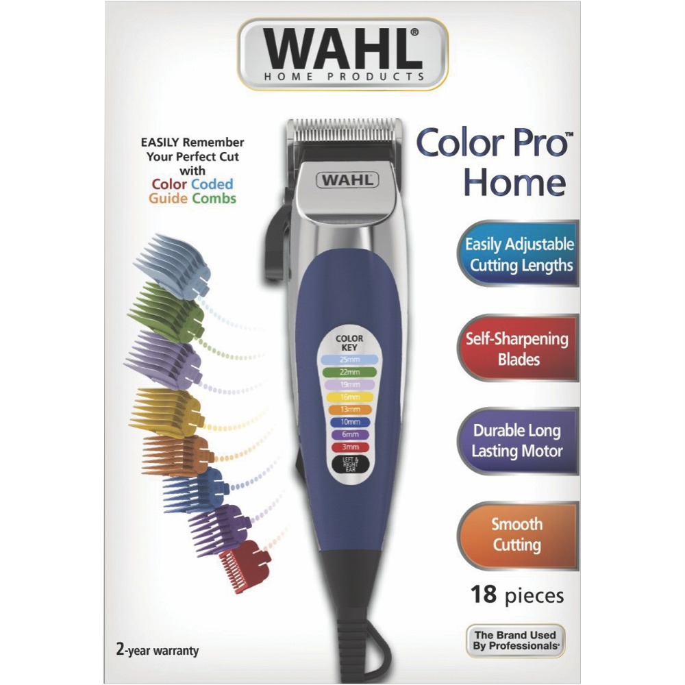 Looking to take your home haircuts to the next level? The Wahl Color Pro Home Clipper Kit (WA9243-7612) has everything you need. With precision-ground blades that stay sharp cut after cut and 10 color-coded guide combs ranging from 3mm to 25mm you can easily achieve the perfect look every time. The vibrating motor and comfortable grip make it a breeze to use while the included scissors barber combs blade guard cleaning brush and oil keep your clipper in top shape. Why pay for expensive salon visits when you can get professional results right at home?