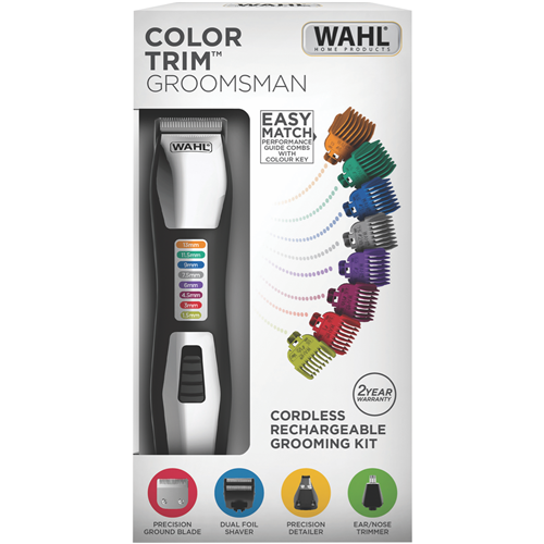 Ready to take your grooming game to the next level? The Wahl Color Trim Groomsman (WA9855-3612) has everything you need for precise styling. With up to 60 minutes of cordless run time and precision ground blades you can achieve your desired look effortlessly. The color-coded guide combs make it a breeze to select the perfect length from 1.5mm to 13mm. Plus the included dual foil shaver ensures a smooth bump-free finish. Whether you're trimming your beard detailing your mustache or tidying up your ear and nose hair this versatile kit has you covered. The Wahl Color Trim Groomsman comes with a 2-year manufacturer's warranty for your peace of mind.