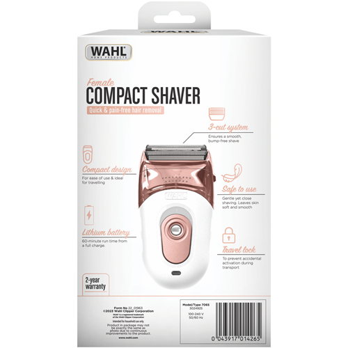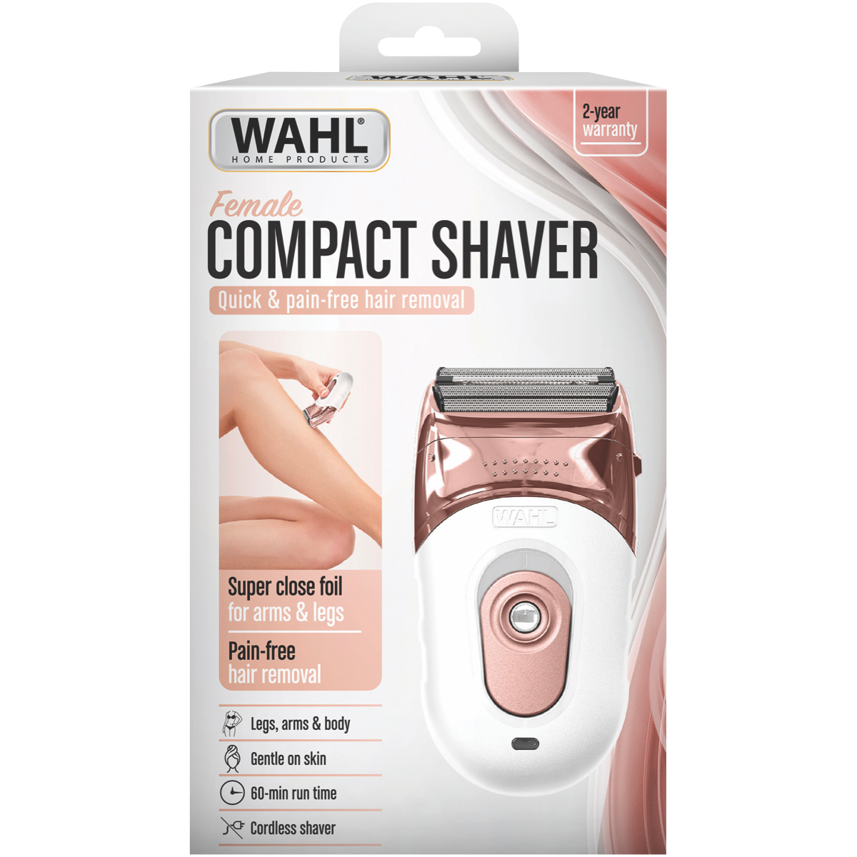 Need a compact shaver that fits neatly in your handbag? The Wahl Ladies Compact Beauty Shaver makes on-the-go hair removal a breeze with its convenient travel-friendly size and design. The sleek white and pink shaver features a lightweight comfortable grip and a 3 cut system with 2 blades and 1 foil for gently removing hair. Perfect for touch-ups between salon visits the battery powered shaver provides up to 60 minutes of cordless use from a single charge. While not waterproof the head is easy to clean with the included brush. With a handy travel lock and storage pouch you can maintain smooth skin anywhere. The Wahl shaver's compact size and cordless convenience make it the perfect companion for quick trims and tidy ups whether you're home or away. Backed by a 2 year manufacturer's warranty. Order the Wahl Ladies Compact Beauty Shaver from The Good Guys today for fuss-free hair removal on the go.