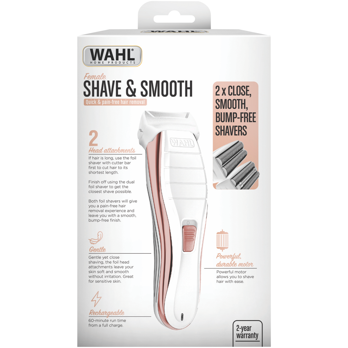 Get the smoothest silkiest skin with the Wahl Ladies Shave and Smooth Arm and Legs. This sleek white rechargeable foil shaver glides effortlessly across the skin gently removing hair for a close comfortable shave every time. The dual foil heads are designed to be gentle on sensitive skin while still trimming and cutting longer hairs. A handy pop up trimmer tackles tricky spots. With up to 60 minutes of cordless shaving per charge you can shave wherever whenever. The ergonomic shape fits neatly in your hand for total control. The kit contains everything you need: the shaver foil guard storage pouch blade oil cleaning brush and charger. It also comes with a 2 year manufacturer's warranty for added peace of mind. Achieve touchably soft stubble-free skin with this must-have women's shaver. Order the Wahl 3025019 today.
