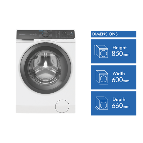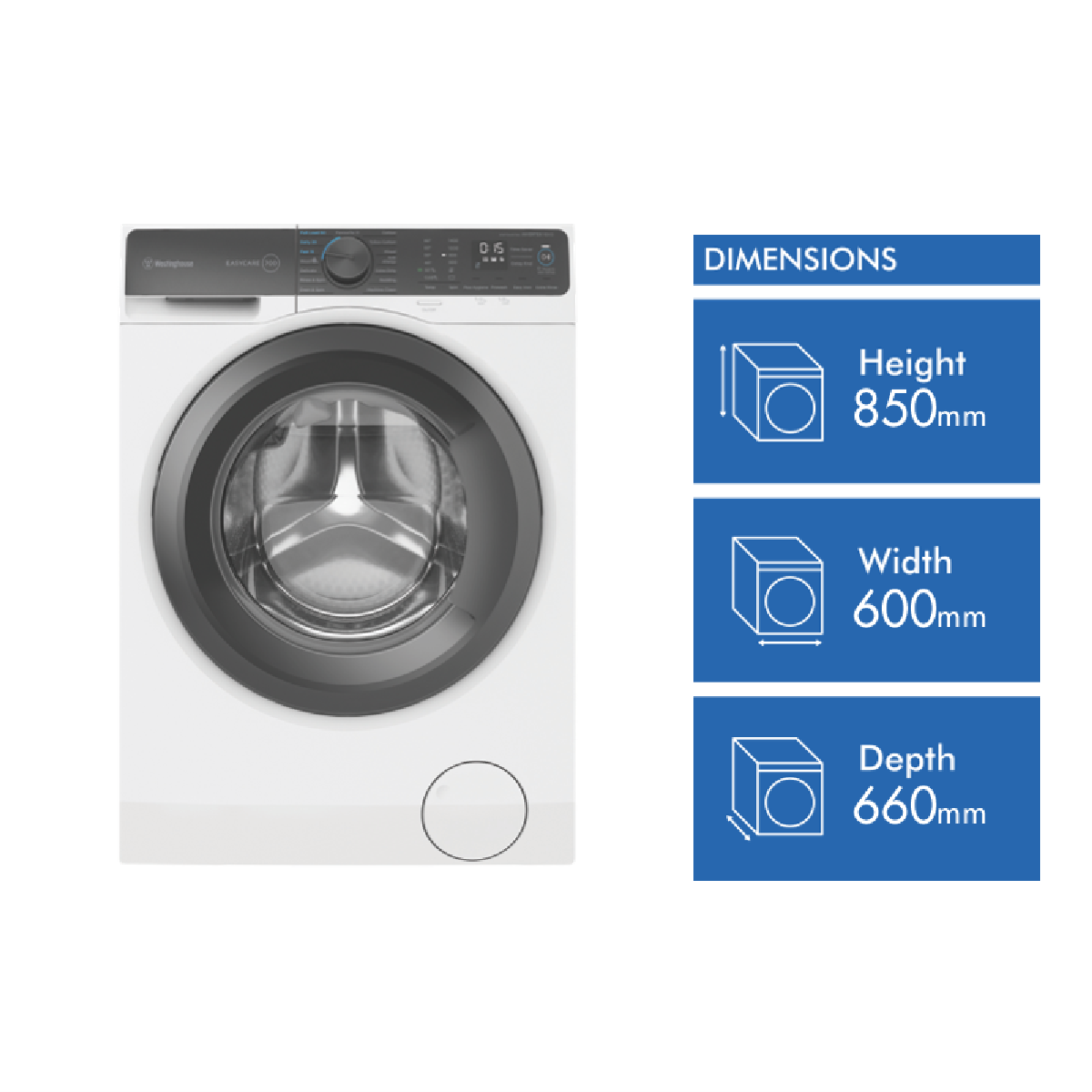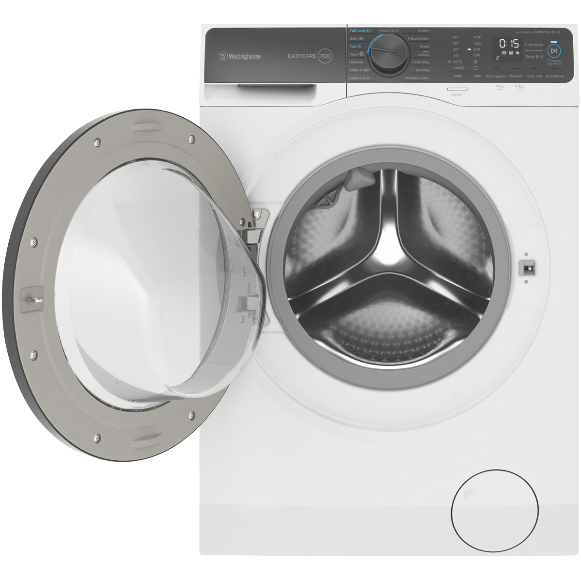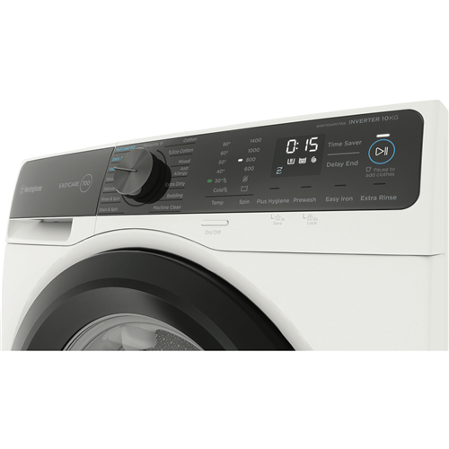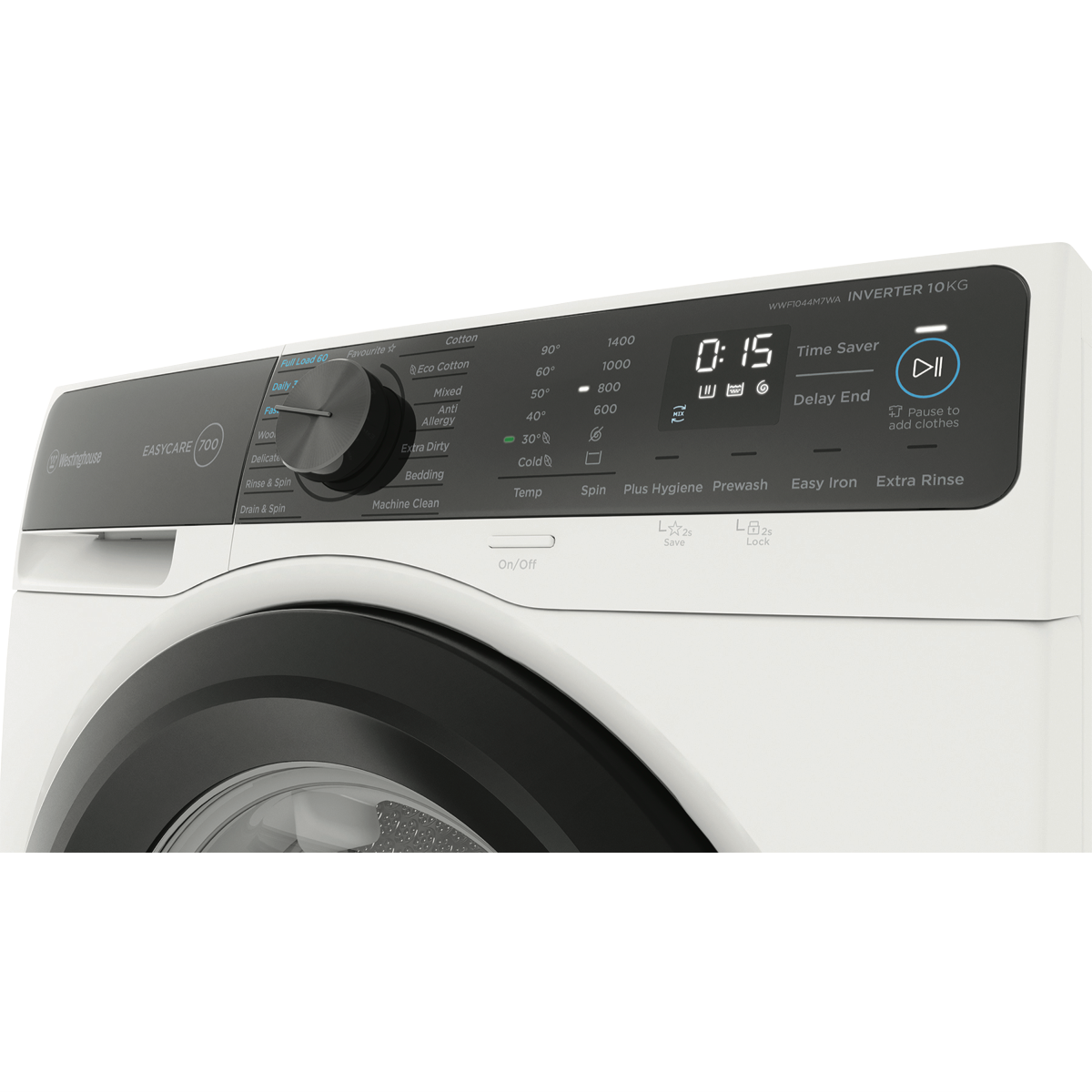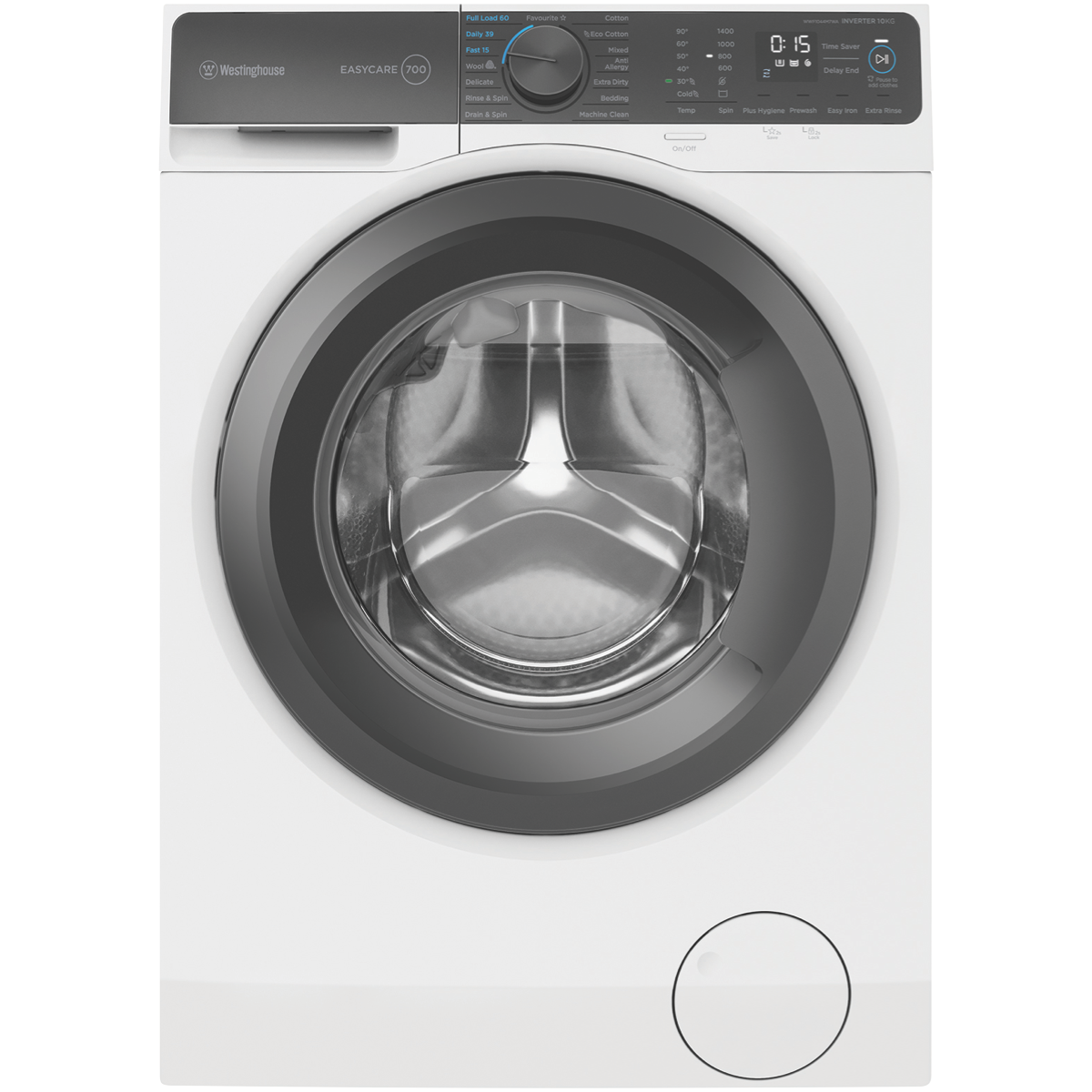 This Westinghouse 10kg front load washing machine offers powerful and efficient performance for busy families. With a generous 10kg capacity the WWF1044M7WA makes light work of large loads. The 1400rpm maximum spin speed means less time hanging clothes out to dry. And a 4.5 star WELS water rating plus 5 star energy rating mean you'll save water and power. The 15 versatile wash programs on this white EasyCare model take care of everything from machine cleaning to anti-allergy and delicate fabrics. Options like Vapour Extra Rinse and Delay End give you extra control. While the easy-access front loader design is gentle on clothes. From school uniforms to bedding the Westinghouse WWF1044M7WA washing machine quietly and efficiently washes for years to come. It features a two year manufacturer's warranty for peace of mind. The manufacturer's part number for this product is WWF1044M7WA. Shop now for an eco-friendly laundry solution.