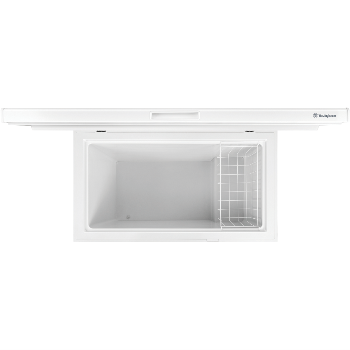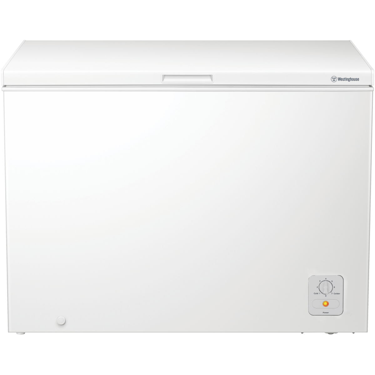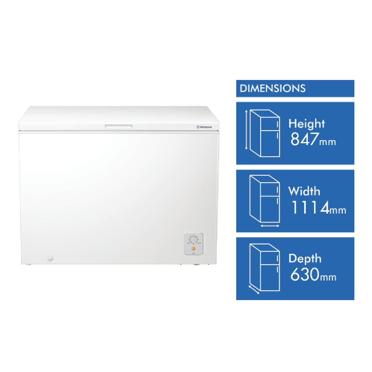 Keep food fresh and frozen for longer with the spacious 300 litre Westinghouse Chest Freezer. With a top opening lid and white smooth finish this chest freezer is an ideal addition to the garage basement or laundry. The quick chill function rapidly cools warm items to lock in flavour and nutrients. While the high insulation removable door seal and hovering door design minimize cold air loss when opening the lid. The removable basket and recessed handle allow for organized storage and easy access. Adjustable legs ultra thin hinges and power-off protection provide added convenience. An energy rating of 3.5 stars means this model is energy efficient. Plus the environmentally friendly R600a refrigerant has minimal global warming potential. Measuring 1114mm W x 847mm H x 630mm D the 300L capacity has ample storage room for bulk frozen goods. Keep your frozen foods fresh for longer with Westinghouse reliability. This chest freezer's manufacturer part number is WCM3000WE. Discover how convenient frozen storage can be shop the Westinghouse 300L Chest Freezer today.