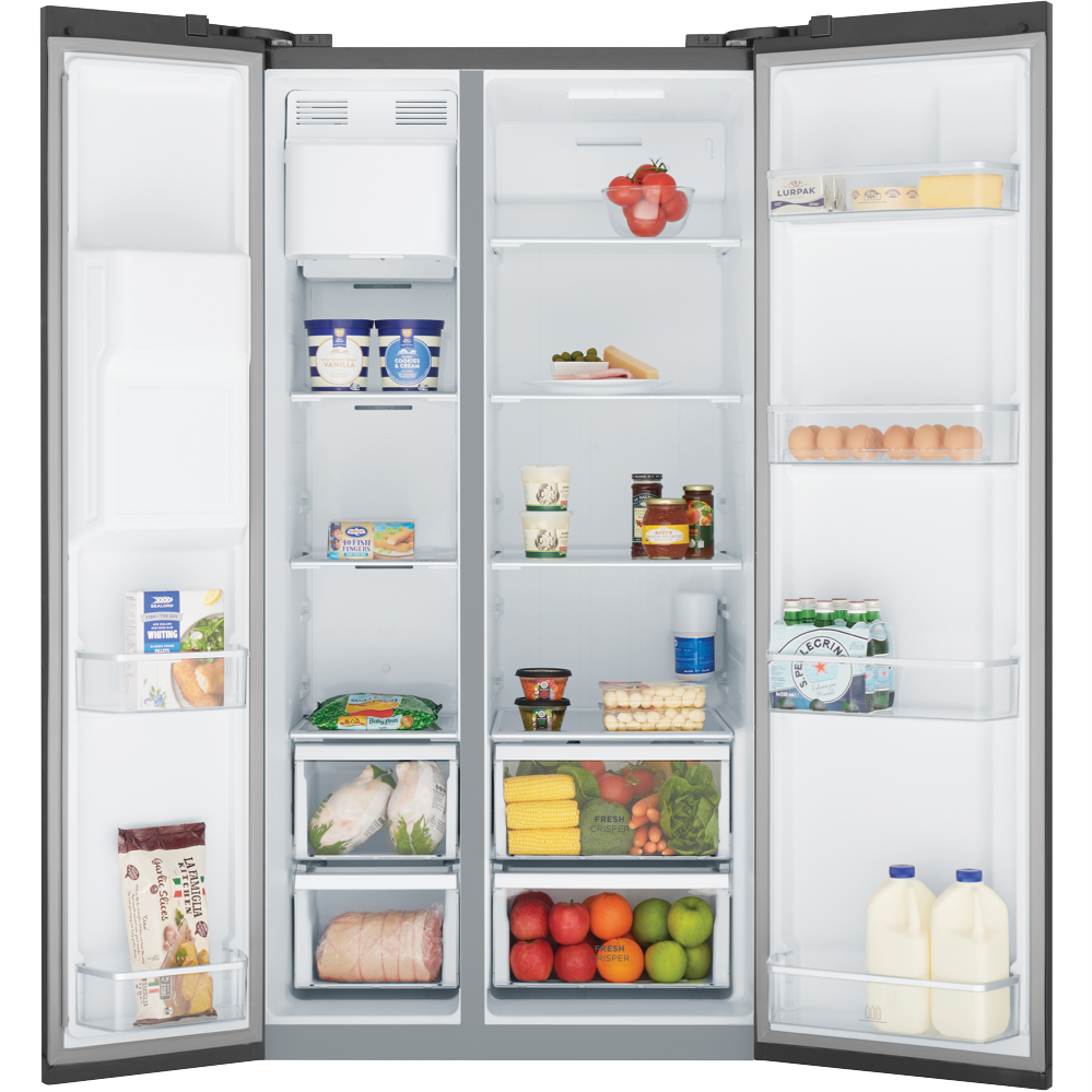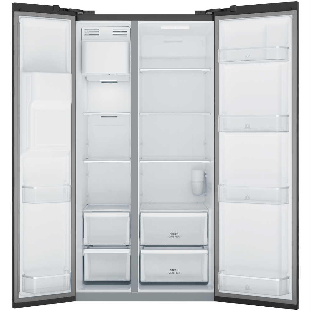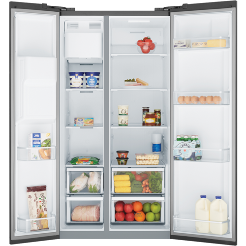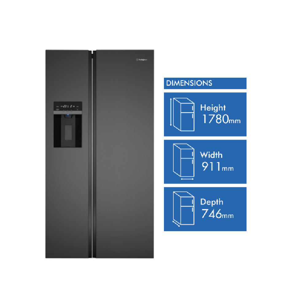 Looking for a fridge that makes everyday life easier and adds a touch of style to your kitchen? This side by side design in a sleek matte black finish gives you a roomy 596 litre total capacity so you can organise groceries for the whole family without feeling cramped. With a plumbed ice and water dispenser right in the door you can pour a cold drink or fill your ice bucket without opening the fridge which helps keep the temperature steady and your food fresher. The dual crispers mean your fruit and veggies stay crunchy while quick chill and quick freeze functions let you handle unexpected grocery hauls or last-minute party prep. Electronic touch controls make it simple to adjust settings and energy-saving holiday mode helps you cut down on power use when you are away. LED lighting brightens every shelf and the handy door alarm reminds you if you have left it open. Thanks to inverter technology this fridge runs efficiently and quietly so you can enjoy a peaceful kitchen. The flat doors with integrated handles complete the modern look. You will get a 4.5 star energy rating so you can feel good about your power bills. Dimensions are 1780 millimetres high 911 wide and 746 deep. Covered by a two year manufacturer s warranty. Model WSE6670BA. Discover how this fridge can simplify your daily routine.