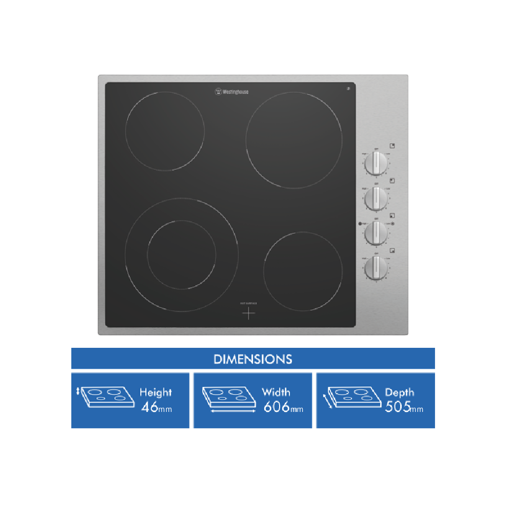 The minimalistic design of the Westinghouse 60cm Ceramic Cooktop WHC642SC offers function and simplicity to your kitchen. Four cooking zones with nine power levels to choose from gives you precise control over your cooking. Knob controls offer easy operation during operation and a sophisticated black ceramic glass finish with a stripe of stainless steel and silver on the trip adds a touch of style to your kitchen. This ceramic cooktop has an easy-to-clean surface that will simply wipe clean with a mild detergent and a damp cloth minimising your time spent in the kitchen.