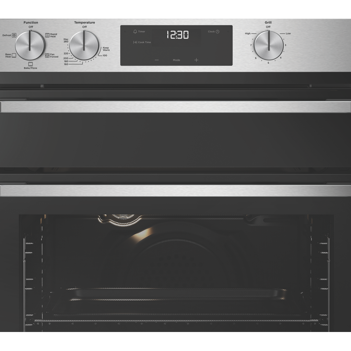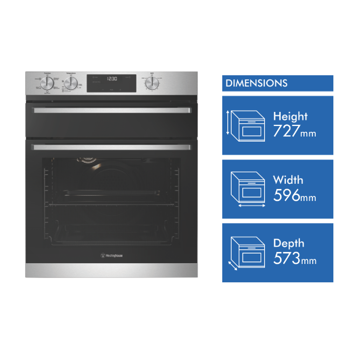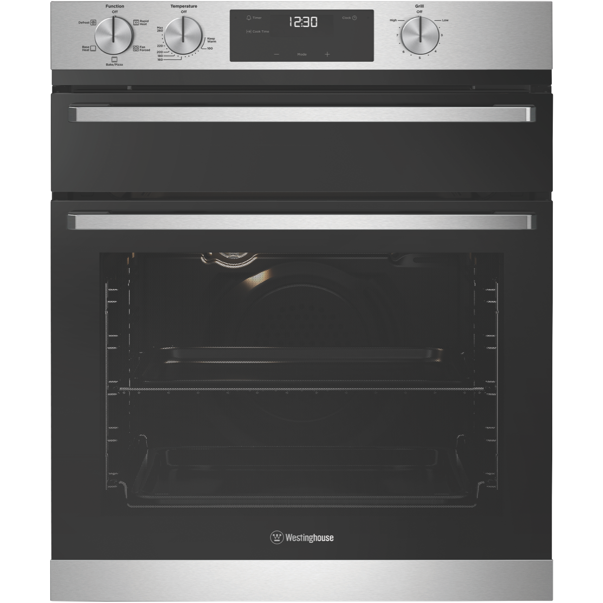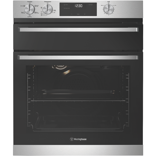 Bring the power of a professional kitchen into your home with the Westinghouse 60cm Electric Double Oven. This stainless steel beauty allows you to cook multiple dishes at once with a spacious 72L main oven and 38L secondary oven. The mark resistant finish keeps your oven looking as good as the meals you'll create. With 5 versatile oven functions like rapid heat bake and fan forced cooking you'll have precision control to prepare everything from crispy pizzas to juicy roasts. The easy glide racks make tending to cooking meals simple. Your dishes will turn out picture-perfect every time. The touch control LED and programmable timer provide exceptional convenience when using this multi-functional electric oven. This double oven comes fully equipped with handy accessories like anti-splatter inserts chromed wire shelves baking trays side racks and more. At 60cm wide it fits most standard kitchen cutouts. The durable stainless steel construction and 2 year warranty ensure this double oven will be cooking up deliciousness for years to come. Installation by a professional is recommended. The manufacturer's part number for this product is WVE6555SD. For delicious family meals this electric double oven is a must-have for your kitchen.