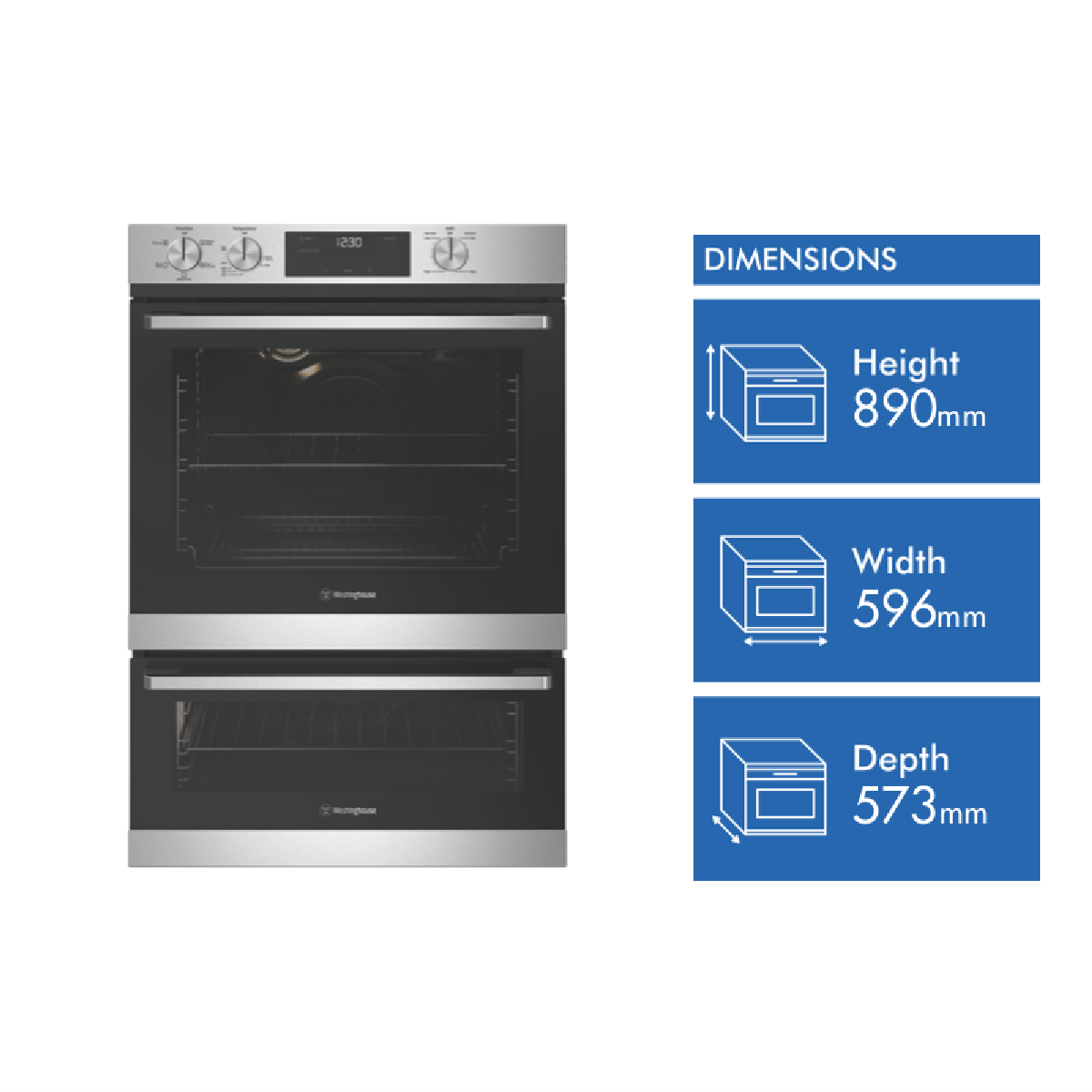 Take your cooking experience to the next level with the Westinghouse 60cm Electric Double Oven with Separate Grill. This versatile stainless steel appliance will be the star of your kitchen with its sleek design and array of convenient features. The spacious 72L main oven has five different functions like rapid heat bake and fan forced cooking so you can prepare everything from crispy pizzas to juicy roasts with ease. Meanwhile the 38L second oven gives you extra room to cook multiple dishes at once. Both ovens are controlled by easy-to-use knobs and an LED touch display with a programmable timer.With a separate grill you can quickly brown meats toast sandwiches and melt cheese on top of casseroles and pasta bakes. The inclusion of handy accessories like a baking tray grill insert and chromed wire shelves provides everything you need to get cooking straight away. Durably constructed with a two year manufacturer's warranty this double oven will be a stylish and reliable addition to your kitchen. The manufacturer's part number for this product is WVE6565SD. Bring home delicious versatility with the Westinghouse 60cm Electric Double Oven today.