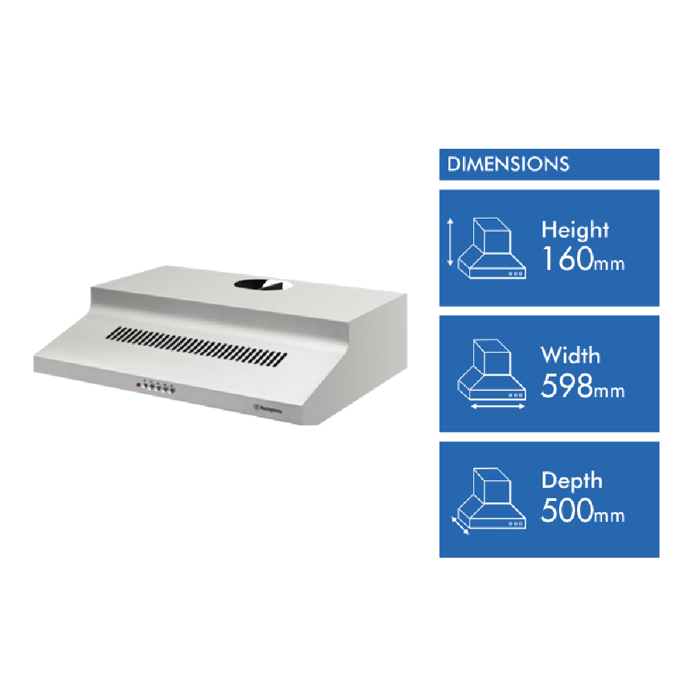 Reduce odours while cooking and keep your kitchen ventilated with this Westinghouse 60cm Universal Fixed Rangehood WRF610SA. Easily installed either partially behind cupboard doors or under cabinetry it is the perfect addition to all types and sizes of kitchen. It has removable filters for easy cleaning so you can keep your kitchen sparkling clean. Easy to use push button controls with three power settings make for a reliable performance for all your diverse cooking needs.