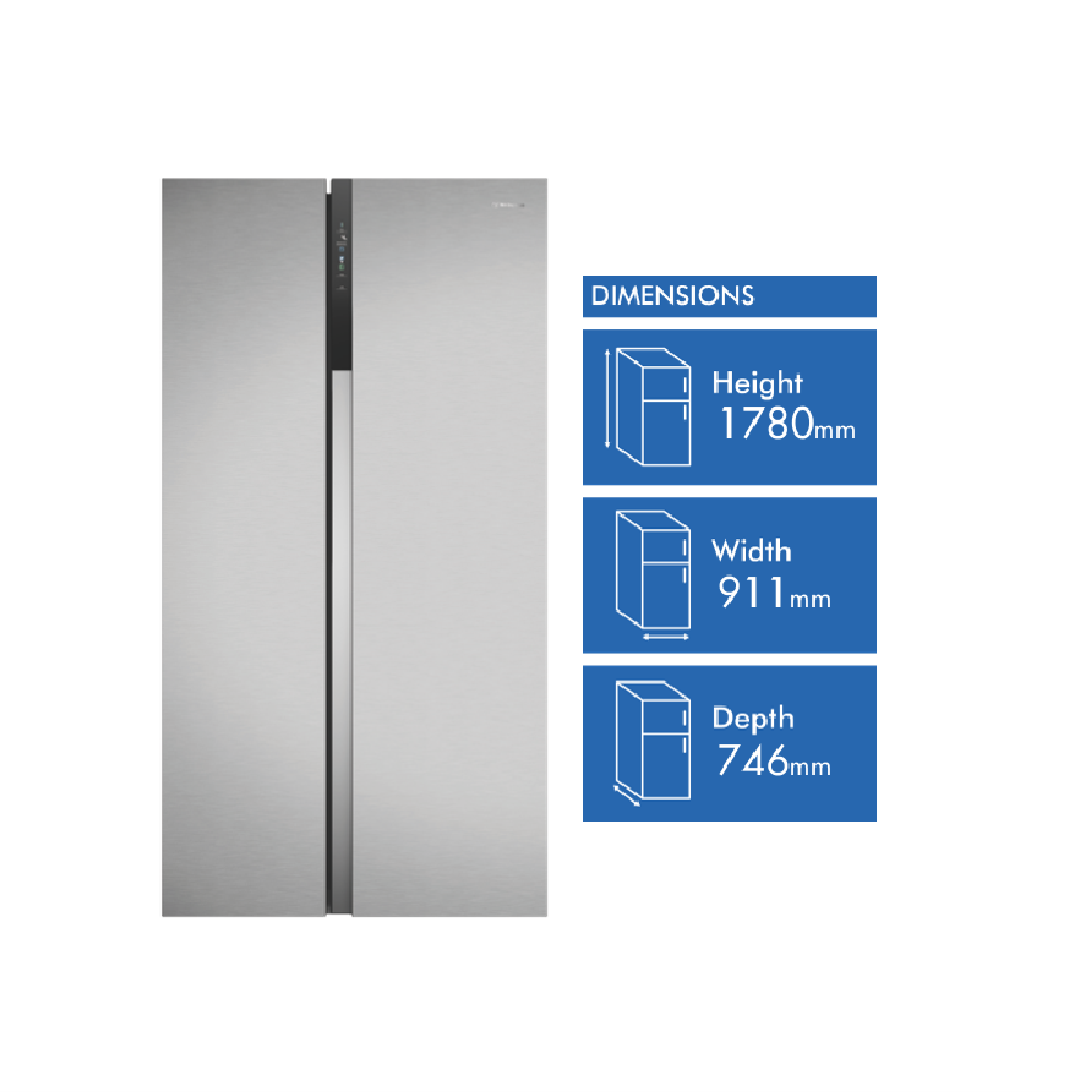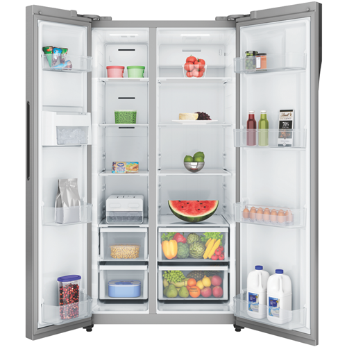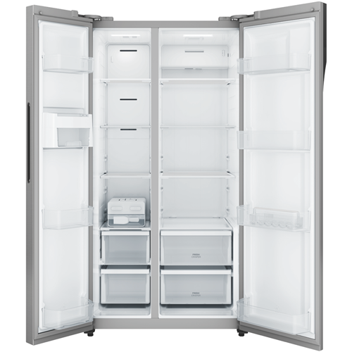 624L side by side fridge silver with Dual FreshCrispers Twist & Serve ice makers Quick Chill and Quick Freeze functions and exceptional 6-star energy rating.