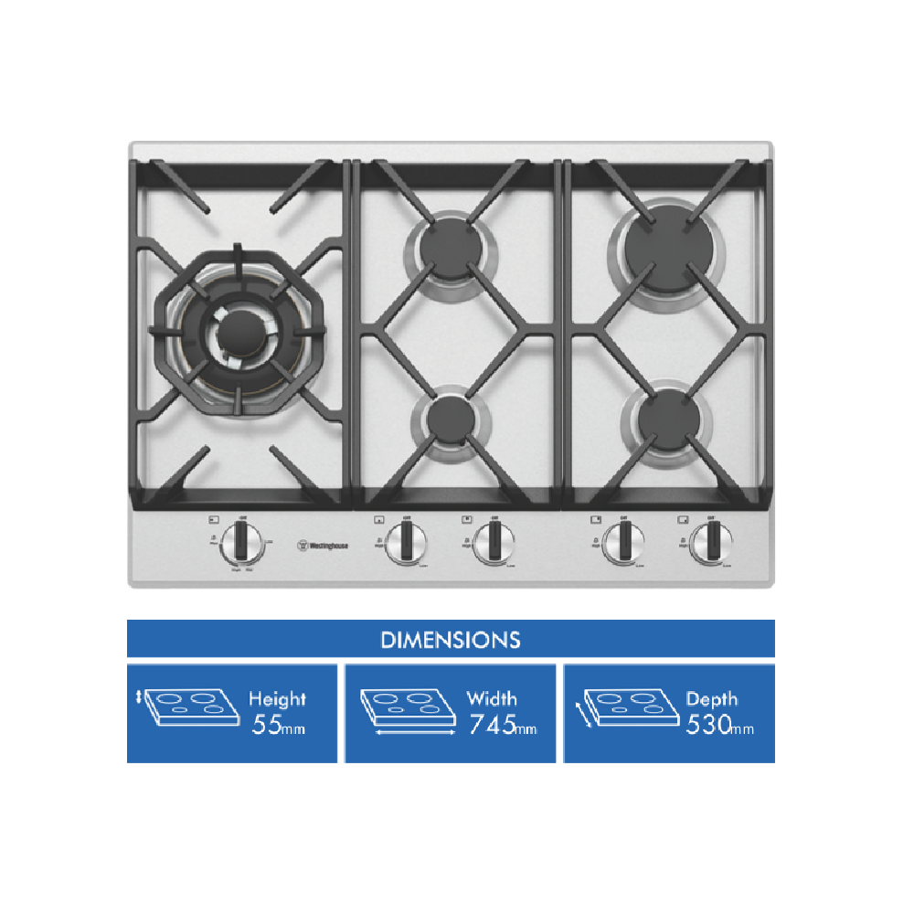 Minimalist design and excellent functionality come together for your everyday cooking convenience with the Westinghouse WHG758SC 75cm stainless steel gas cooktop. The five burners are operated by an easy start knob ignition and feature simple control panel graphics to help you stay in control of the cooking process. This cooktop comes with a high powered intense wok burner offering high heat and even flame distribution so you can lock in flavour and create dishes the whole family will love. Plus the smart Dual Valve flame control allows you to reduce your boiling water and soups from boil to simmer in an instant. Should your pot boil over and extinguish the gas flame the Flame Failure Device will kick in automatically shutting down the gas supply for your safety. The flat cast iron trivets have been designed for better pot stability keeping your pots and pans in place during cooking. Cleaning is easy with three removable cast iron trivets and a flat stainless steel surface. The Westinghouse WHG758SC stainless steel gas cooktop offers functionality and style for your kitchen.