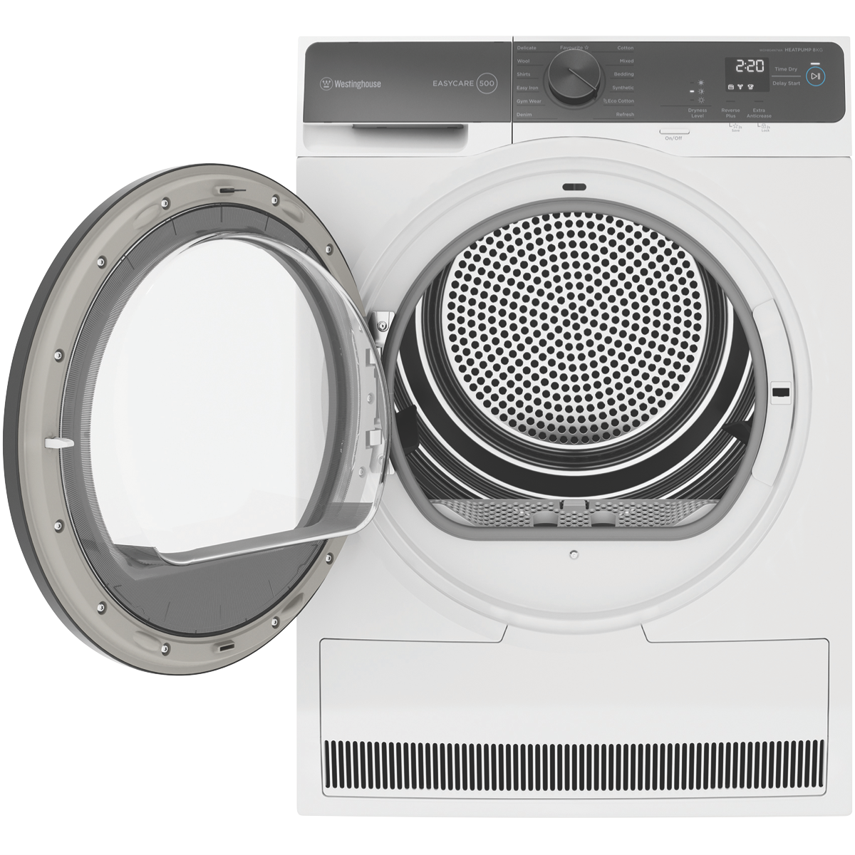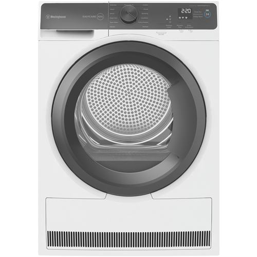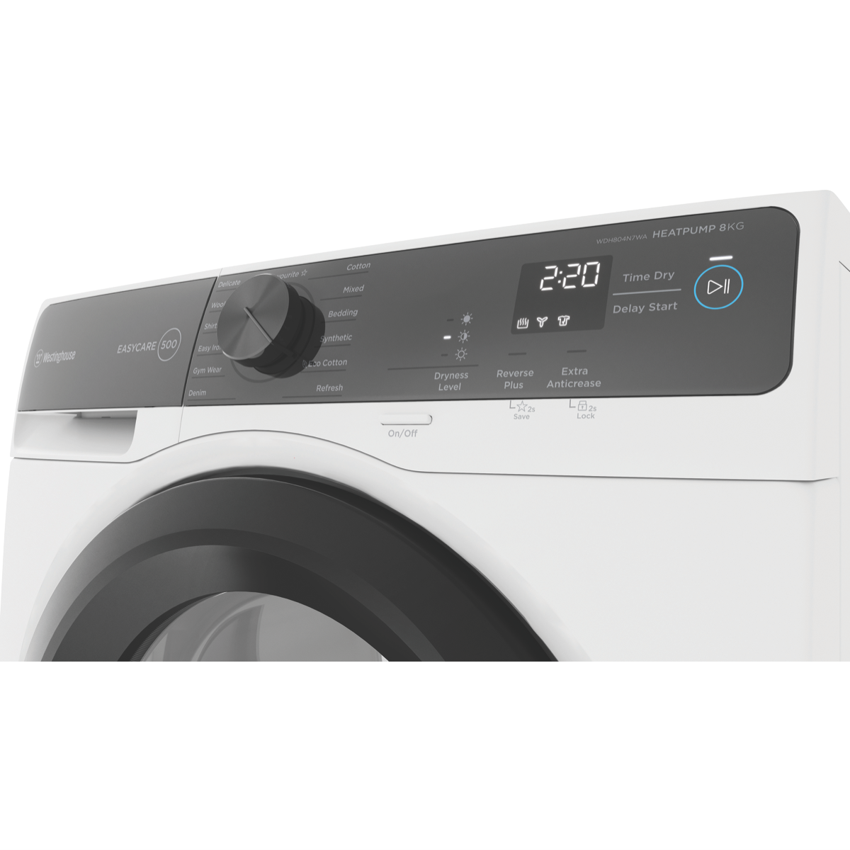 Cut your drying time and save with the Westinghouse 8kg Heat Pump Dryer. This energy-efficient clothes dryer features a large 8kg capacity to handle medium to large loads. The innovative heat pump technology gently dries clothes while using less energy compared to conventional dryers as evidenced by its impressive 7 star energy rating. Thirteen versatile drying programs allow you to customize cycles for all fabrics like cotton synthetics wool delicate items denim bedding and more. Options like the extra anti-crease setting reverse tumbling action auto cool down and delicates mode ensure your garments are dried and finished just right. With a sleek white finish this dryer blends seamlessly into any laundry. The easy-to-use rotary dial control and LCD display make operation a breeze. The sensor dry function automatically adjusts drying time and temperature for optimal results. At 600mm wide 850mm high and 662mm deep the dryer fits most laundry spaces. Plus the two year manufacturer's warranty provides added peace of mind. Give your laundry an energy-efficient upgrade with the Westinghouse Heat Pump Dryer. The manufacturer's part number for this product is WDH804N7WA.