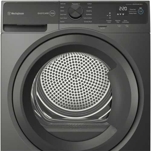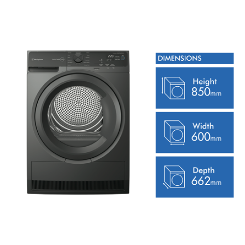 Eco-friendly home laundry gets easy with the Westinghouse 8kg Heat Pump Dryer. With a generous 8kg capacity 15 tailored drying programs and a 7 star energy rating this smart dryer is designed to gently care for all your fabrics while saving energy and water. Sensor Dry Technology precisely monitors moisture levels automatically stopping when clothes are dry preventing over-drying and saving electricity. The intuitive control panel makes operation a breeze with delay start extra anti-crease and cupboard dry options. Metallic grey in a stylish finish the dryer's 850mm height and slimline 600mm width allow flexible installation. EasyCare 700 series features include child lock cool down function lint filter alert and drum light. Covered by a 2 year warranty the WDH804N8SA delivers efficient eco-friendly drying for busy households. With its clever technology and generous capacity this Westinghouse model is the sensible choice for easy energy-saving laundry days.