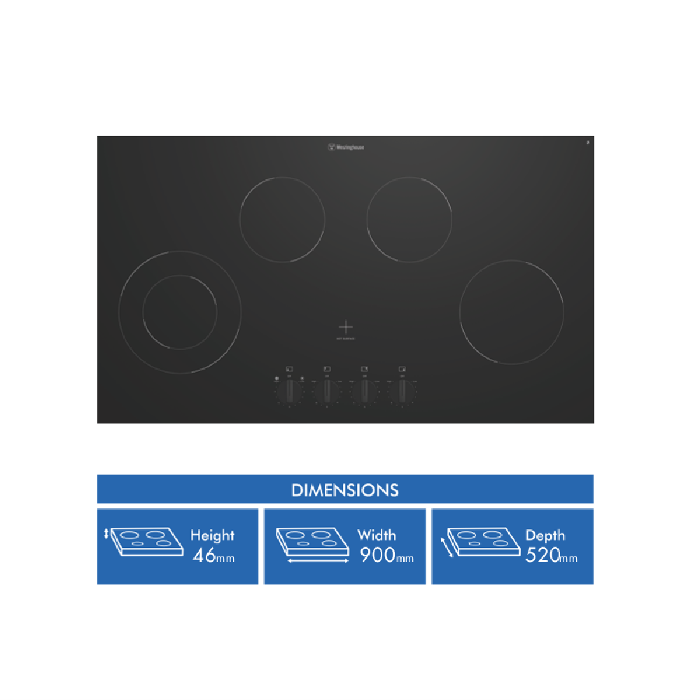 The minimalistic design of the Westinghouse 90cm Ceramic Cooktop WHC942BC offers function and simplicity to your kitchen. Four cooking zones with nine power levels to choose from and a dual zone hotplate for varied pot sizes give you precise control over your cooking. Knob controls offer easy operation and the sophisticated black ceramic glass finish that adds a touch of style to your kitchen. This ceramic cooktop has an easy-to-clean surface that will simply wipe clean with a mild detergent and a damp cloth minimising your time spent in the kitchen.